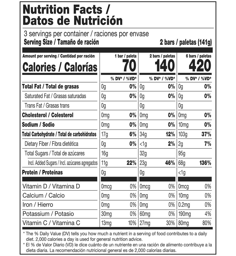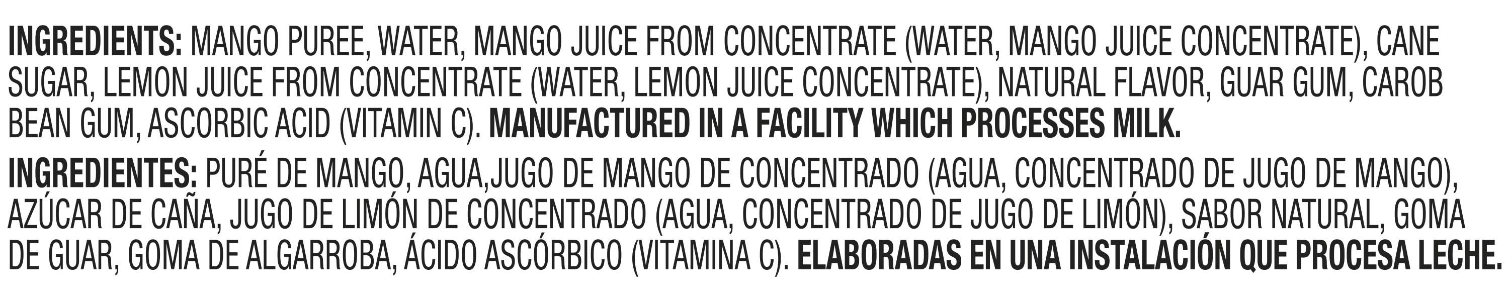 Ingredients: Mango Puree, Water, Mango Juice from Concentrate, Cane Sugar, Lemon Juice from Concentrate, Natural Flavor, Guar Gum, Carob Bean Gum, Ascorbic Acid (Vitamin C)