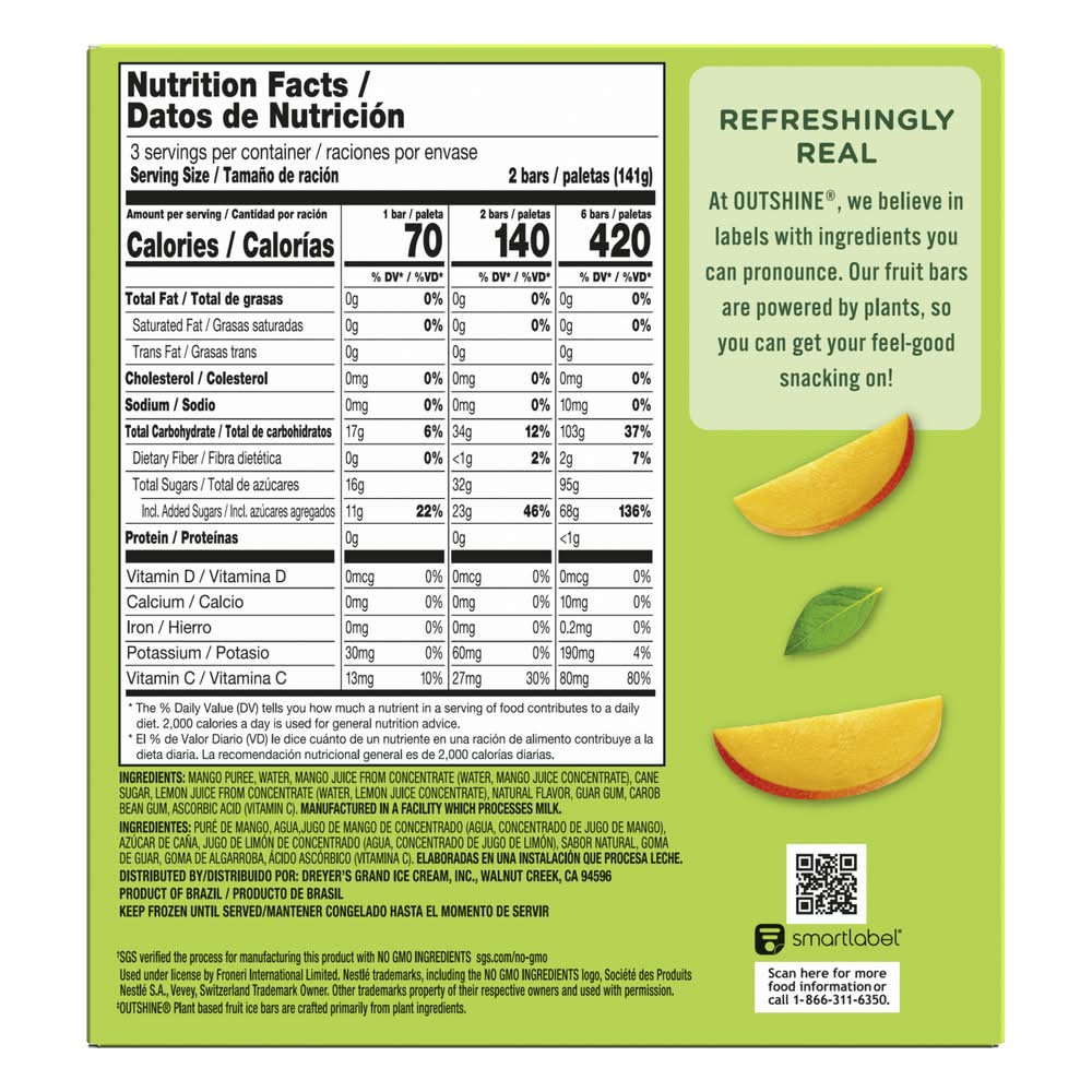 These gluten free bars are made with real fruit, delivering the sweet essence of real mango to keep you cool and refreshed. Each Outshine frozen fruit bar is made with no GMO ingredients and has no artificial colors, flavors, sweeteners or high fructose corn syrup for a feel-good snack. Enjoy these wholesome fat free bars any time of day, whether you want a feel-good mango snack or need a little afternoon pick-me-up. Snack brighter. These fruit bars are good source of vitamin C. Try the whole range of Bars to find your new favorite summertime snack or after-dinner delight. Choose from fruit bars, fruit bars with no sugar added, variety packs, and more. You can even mix and match your favorite in a blender (remember to remove the sticks!) to make deliciously refreshing mocktails that are sure to cool down any hot afternoon. With more than a dozen real fruit flavors to choose from including creamy coconut, strawberry, pineapple, grape, and more, the possibilities are endless! • Flavor: Mango • Dreyer's Grand Ice Cream, Inc., Oakland, CA 94618