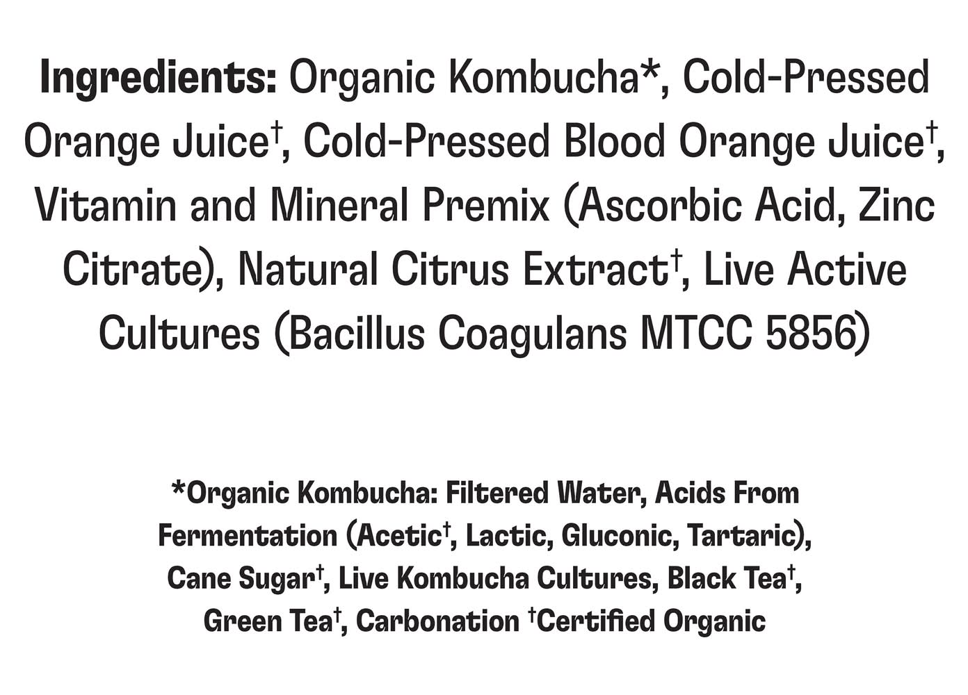 Ingredients: Organic Kombucha (Organic Kombucha: Filtered Water, Acids from Fermentation (Acetic (Certified Organic), Lactic, Gluconic, Tartaric)), Gold-Pressed Orange Juice (Certified Organic), Cold-Pressed Blood Orange Juice (Certified Organic), Vitamin and Mineral Premix (Ascorbic Acid, Zinc Citrate), Natural Citrus Extract (Certified Organic), Live Active Cultures (Bacillus Coagulans MTCC 5856) Cane Sugar (Certified Organic), Live Kombucha Cultures, Black Tea (Certified Organic), Green Tea (Certified Organic), Carbonation
