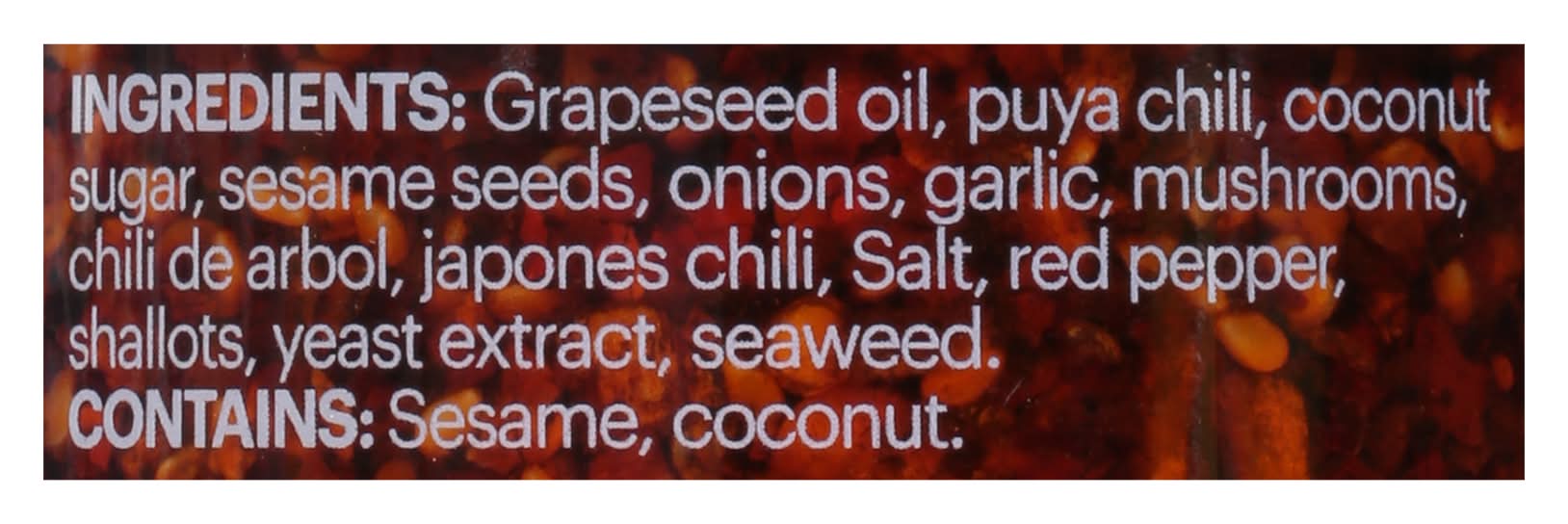 Ingredients: Grapeseed Oil, Puya Chili, Coconut Sugar, Sesame Seeds, Onions, Garlic, Mushrooms, Chili De Arbol, Japones Chili, Salt, Red Pepper, Shallots, Yeast Extract, Seaweed Contains: Coconut, Sesame