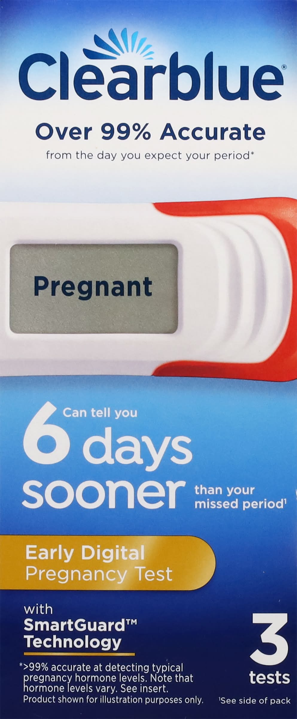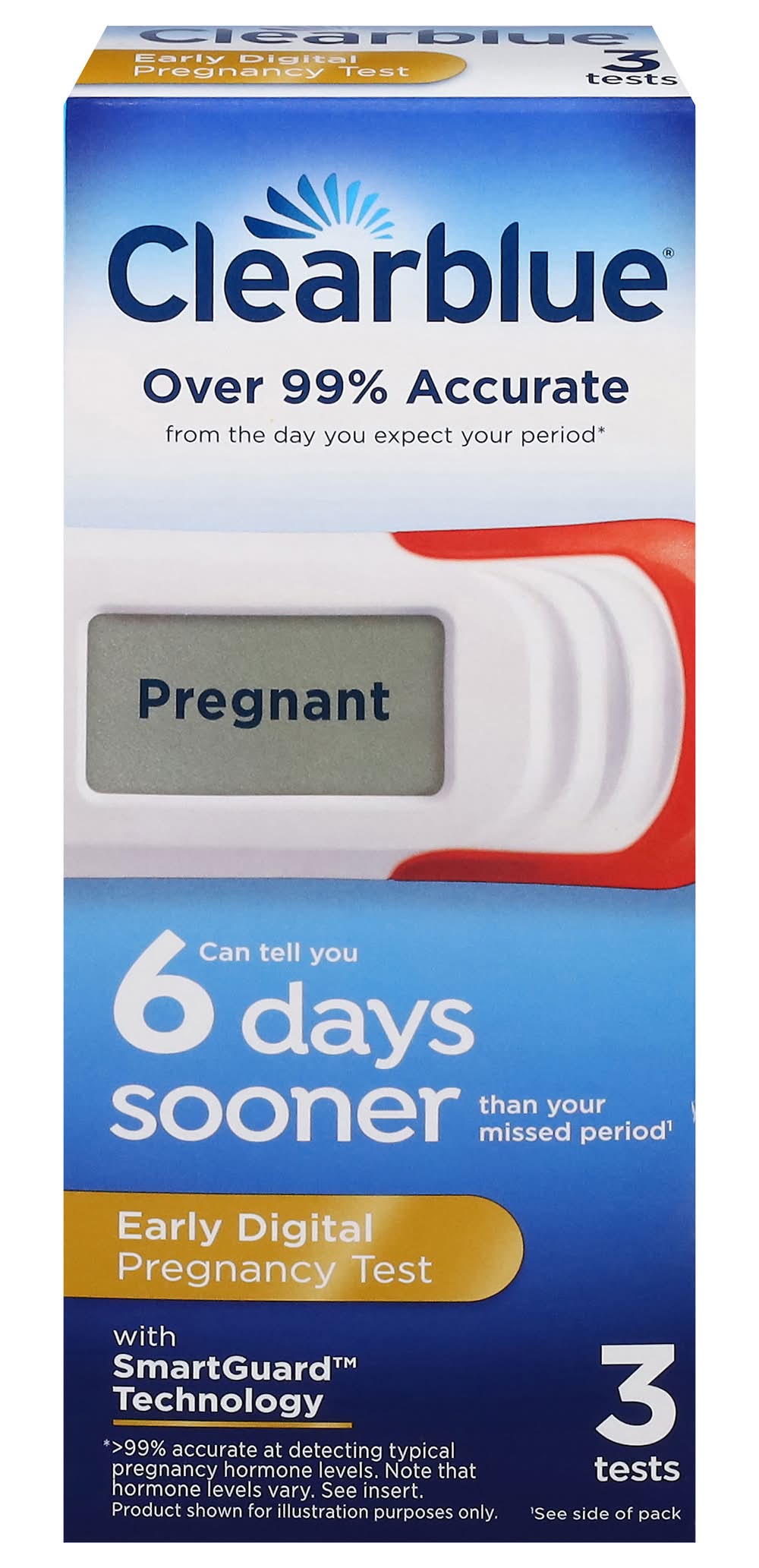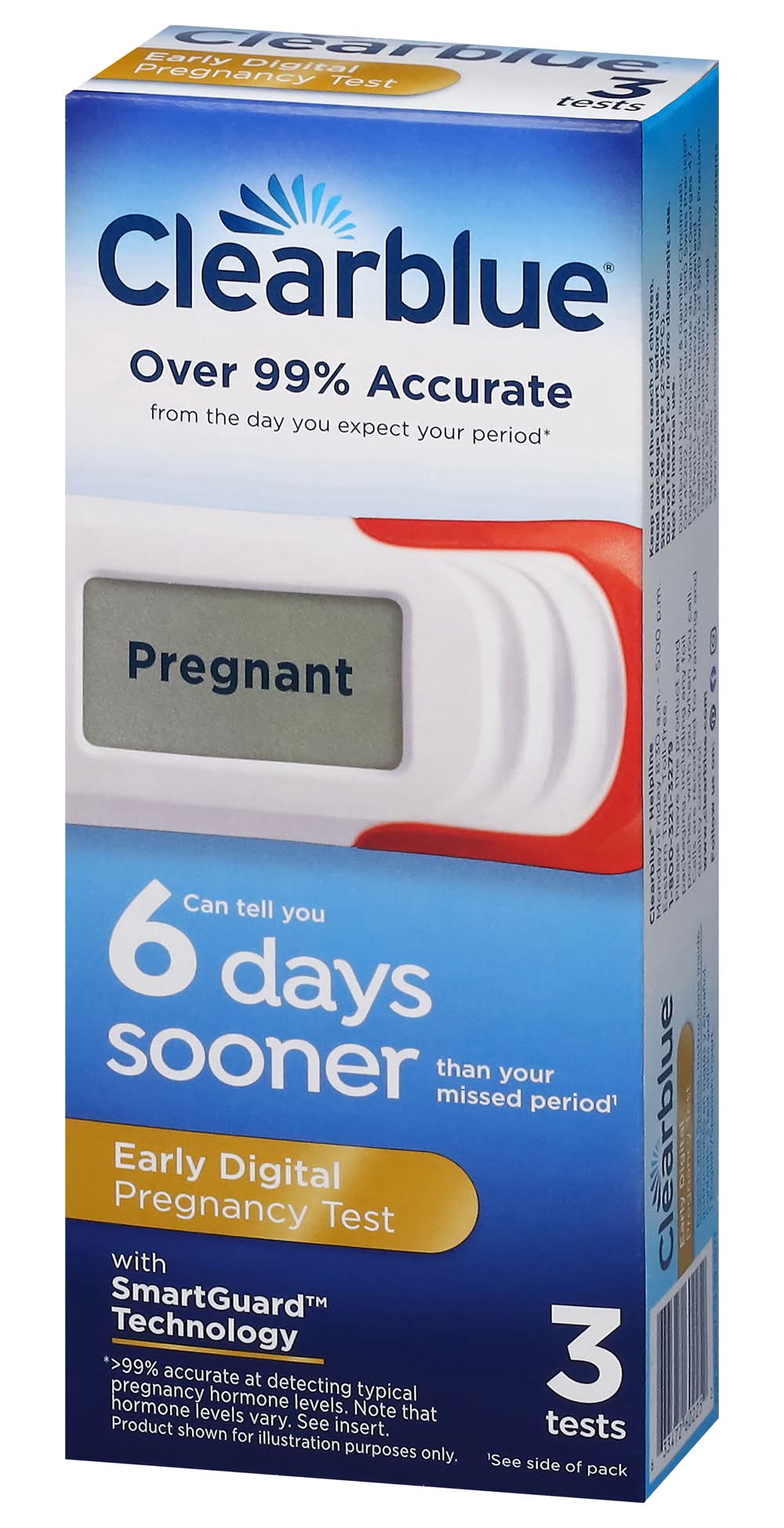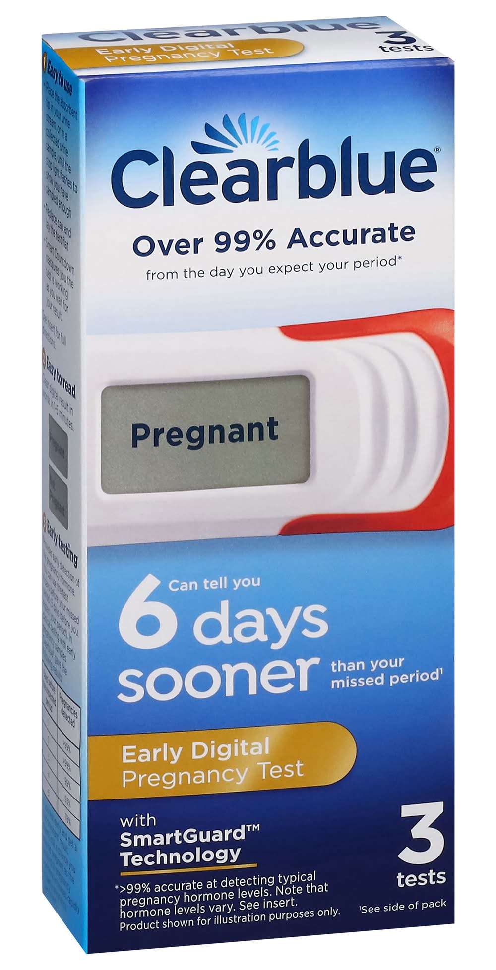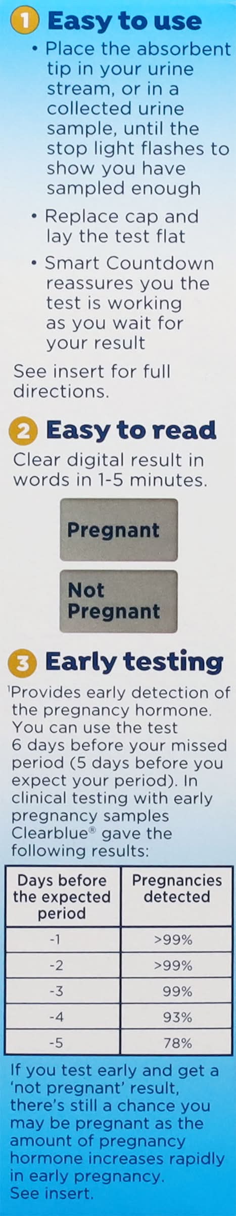 Wondering if you're pregnant? Waiting for your results can be super exciting... and even a little nerve-racking. That's why, if you don't want to wait to test until you miss your period, try the Clearblue Early Digital Pregnancy Test [Clearblue Prueba de Embarazo Digital Temprana] for results up to 6 days early[2]. The Clearblue Early Digital Pregnancy Test is our most sensitive digital home pregnancy test[4], delivering results up to 6 days before you miss your period[2]. Once the test is running, the Smart Countdown will appear on screen to reassure you the test is progressing, counting down to your clear digital result in words, within just 1-5 minutes. Each pack includes 3 individually wrapped digital pregnancy tests that detect the "pregnancy hormone" (hCG), which starts showing up in your urine shortly after implantation. This early pregnancy test is easy to grip and has an extra-wide tip for easy urine sampling. Plus, it features a digital display that gives clear results ("Pregnant" or "Not Pregnant"). Over 99% accurate[1], you can feel confident in your results. [1] Over 99% accurate from the day you expect your period. >99% accurate at detecting typical pregnancy hormone levels. Note that hormone levels vary. See insert. [2] 78% of pregnant results can be detected 6 days before your missed period. [3] Test sensitivity is 10mIU/ml. [4] vs. other Clearblue digital tests