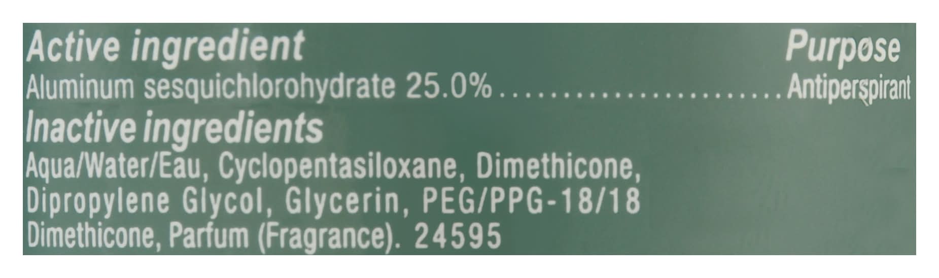 Ingredients: Active Ingredients: Aluminum Sesquichlorohydrate (25.0 %), Antiperspirant. Inactive Ingredients: Aqua/Water/Eau, Cyclopentasiloxane, Dimethicone, Dipropylene Glycol, Glycerin, PEG/PPG-18/18 Dimethicone, Parfum (Fragrance) Additives: Inactive Ingredients: Aqua/Water/Eau, Cyclopentasiloxane, Dimethicone, Dipropylene Glycol, Glycerin, PEG/PPG-18/18 Dimethicone, Parfum (Fragrance).