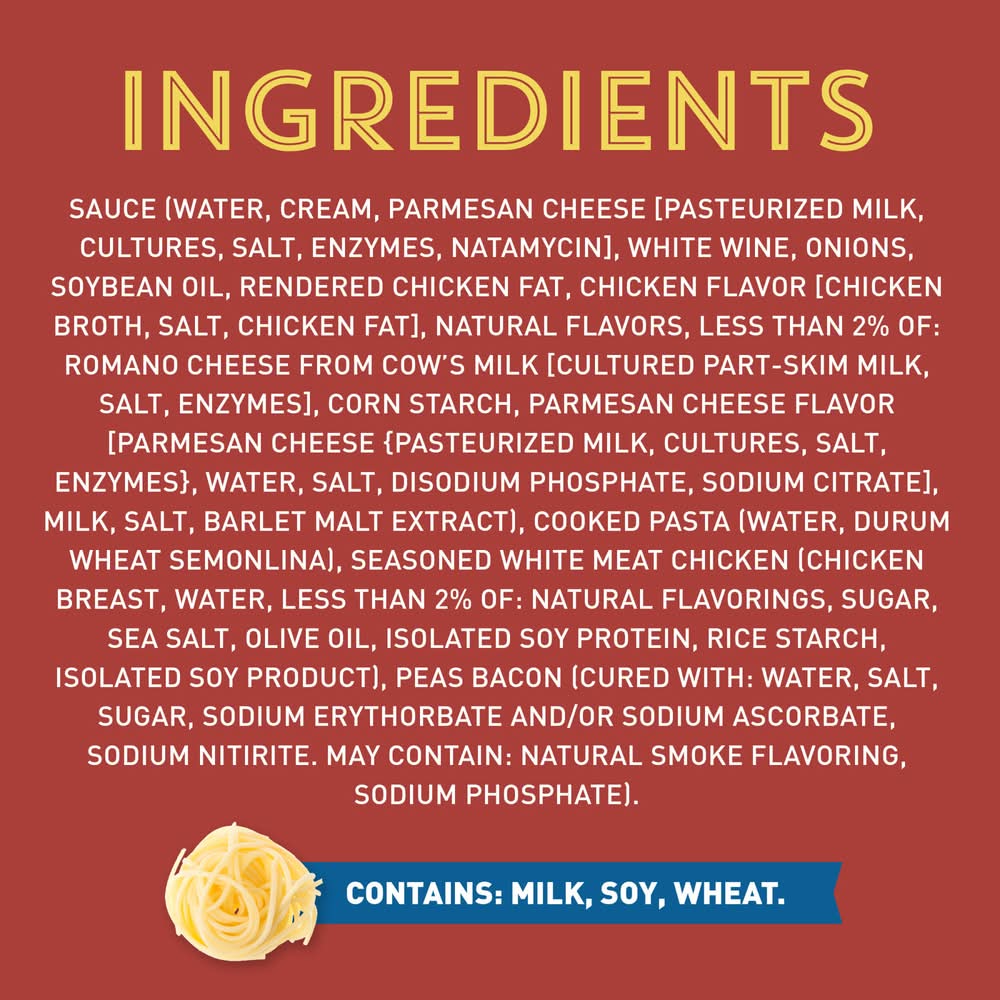 Ingredients: Sauce (Water, Parmesan Cheese [Pasteurized Milk, Cultures, Salt, Enzymes, Natamycin], Cream, White Wine, Onions, Soybean Oil, Rendered Chicken Fat, Chicken Flavor [Chicken Broth, Salt, Chicken Fat], Natural Flavor, Less Than 2% Of: Romano Cheese from Cow's Milk [Cultured Part-Skim Milk, Salt, Enzymes], Corn Starch, Milk, Salt, Barley Malt Extract), Cooked Pasta (Water, Durum Wheat Semolina), Seasoned White Meat Chicken (Chicken Breast with Rib Meat, Water, Less Than 2% Of: Natural Flavorings, Sugar, Olive Oil, Isolated Soy Protein, Salt, Potato Starch), Peas, Bacon (Cured with: Water, Salt, Sugar, Sodium Erythorbate And/Or Sodium Ascorbate, Sodium Nitrite. May Contain: Natural Smoke Flavoring, Sodium Phosphate), . CONTAINS: MILK, SOY, WHEAT. Contains: Soybeans, Wheat, Milk