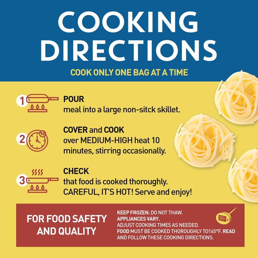 Directions for use: Cook thoroughly. Ready in 10 minutes. Pour meal into a large non-stick skillet. Cover and cook over medium-high heat 10 to 11 minutes, stirring occasionally. Check that food is cooked thoroughly. Careful, it's hot! Serve and enjoy! For Food Safety & Quality: Keep frozen. Do not thaw. Appliances vary. Adjust cooking times as needed. Food must be cooked thoroughly to 165 degrees F. Read and follow these cooking instructions. Keep frozen. Storage recommendation: Keep frozen.