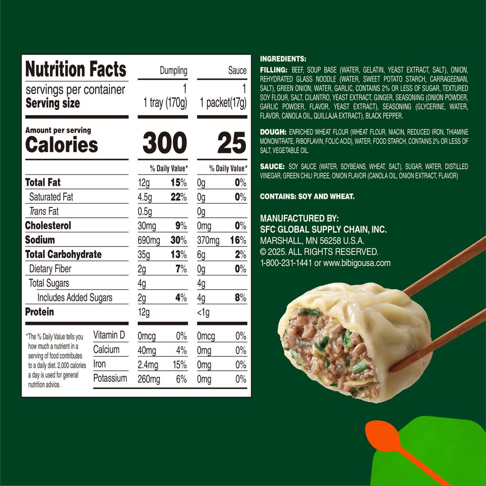 Ingredients: STEAMED DUMPLINGS INGREDIENTS: FILLING: BEEF, SOUP BASE (WATER, GELATIN, YEAST EXTRACT, SALT), ONION, REHYDRATED GLASS NOODLES (WATER, SWEET POTATO STARCH, CARRAGEENAN, SALT), GREEN ONION, WATER, GARLIC, CONTAINS 2% OR LESS OF SUGAR, TEXTURED SOY FLOUR, SALT, CILANTRO, YEAST EXTRACT, GINGER, SEASONING (ONION POWDER, GARLIC POWDER, FLAVOR, YEAST EXTRACT), SEASONING (GLYCERINE, WATER, FLAVOR, CANOLA OIL, QUILLAJA EXTRACT), BLACK PEPPER. DOUGH: ENRICHED WHEAT FLOUR (WHEAT FLOUR, NIACIN, REDUCED IRON, THIAMINE MONONITRATE, RIBOFLAVIN, FOLIC ACID), WATER, FOOD STARCH, CONTAINS 2% OR LESS OF SALT, VEGETABLE OIL. SAUCE INGREDIENTS: SOY SAUCE (WATER, SOYBEANS, WHEAT, SALT), SUGAR, WATER, DISTILLED VINEGAR, GREEN CHILI PUREE, ONION FLAVOR (CANOLA OIL, ONION EXTRACT, FLAVOR) Contains: Wheat, Soy