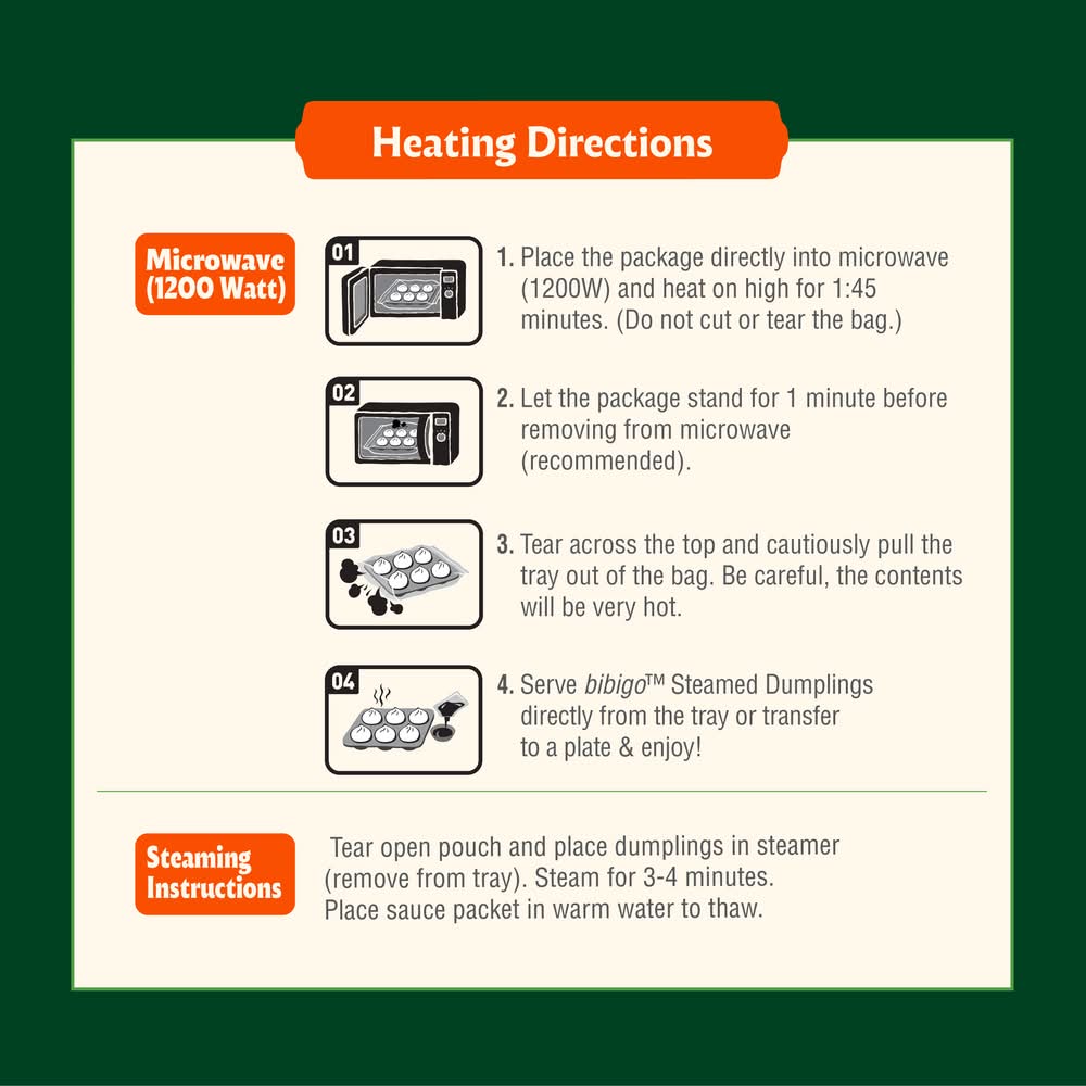 Directions for use: Microwave Directions (Caution! These dumplings will be hot. Carefully bite the top or side of the dumpling to let the inside cool before consuming. Based on 1200 watt microwave. Microwave heating time may vary depending microwave oven wattage. Reheating is not recommended for this product. Not for frying, baking, conventional oven or other direct heat appliance use. Keep frozen until ready to heat, do not thaw): Cut: Cut one corner of the pouch to allow steam to escape. Place sauce packet in warm water to thaw. Heat & Wait: Place pouch in microwave and heat on high for 1:45 minutes. (Recommend to let stand for 1 minute). Open: Carefully open bag and remove tray. Be careful! Enjoy! Don't forget the dipping sauce! Steaming Instruction (Caution! These dumplings will be hot. Carefully bite the top or side of the dumpling to let the inside cool before consuming. Based on 1200 watt microwave. Microwave heating time may vary depending microwave oven wattage. Reheating is not recommended for this product. Not for frying, baking, conventional oven or other direct heat appliance use. Keep frozen until ready to heat, do not thaw): Tear open pouch and place dumplings in steamer (remove from tray). Steam for 3-4 minutes. Keep frozen. Storage recommendation: Keep frozen.