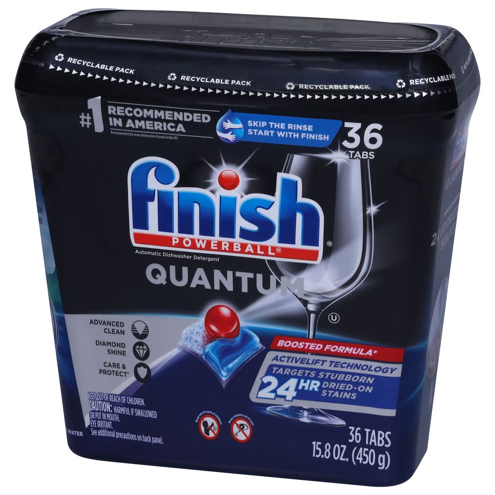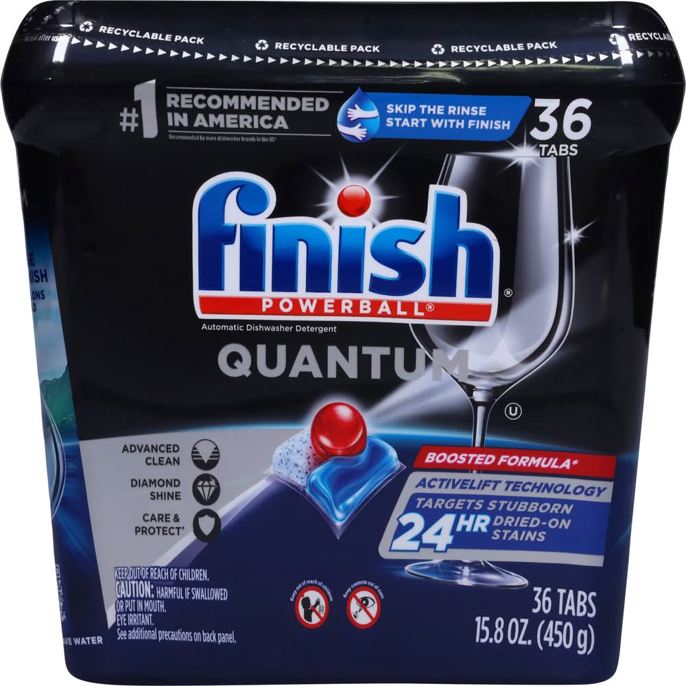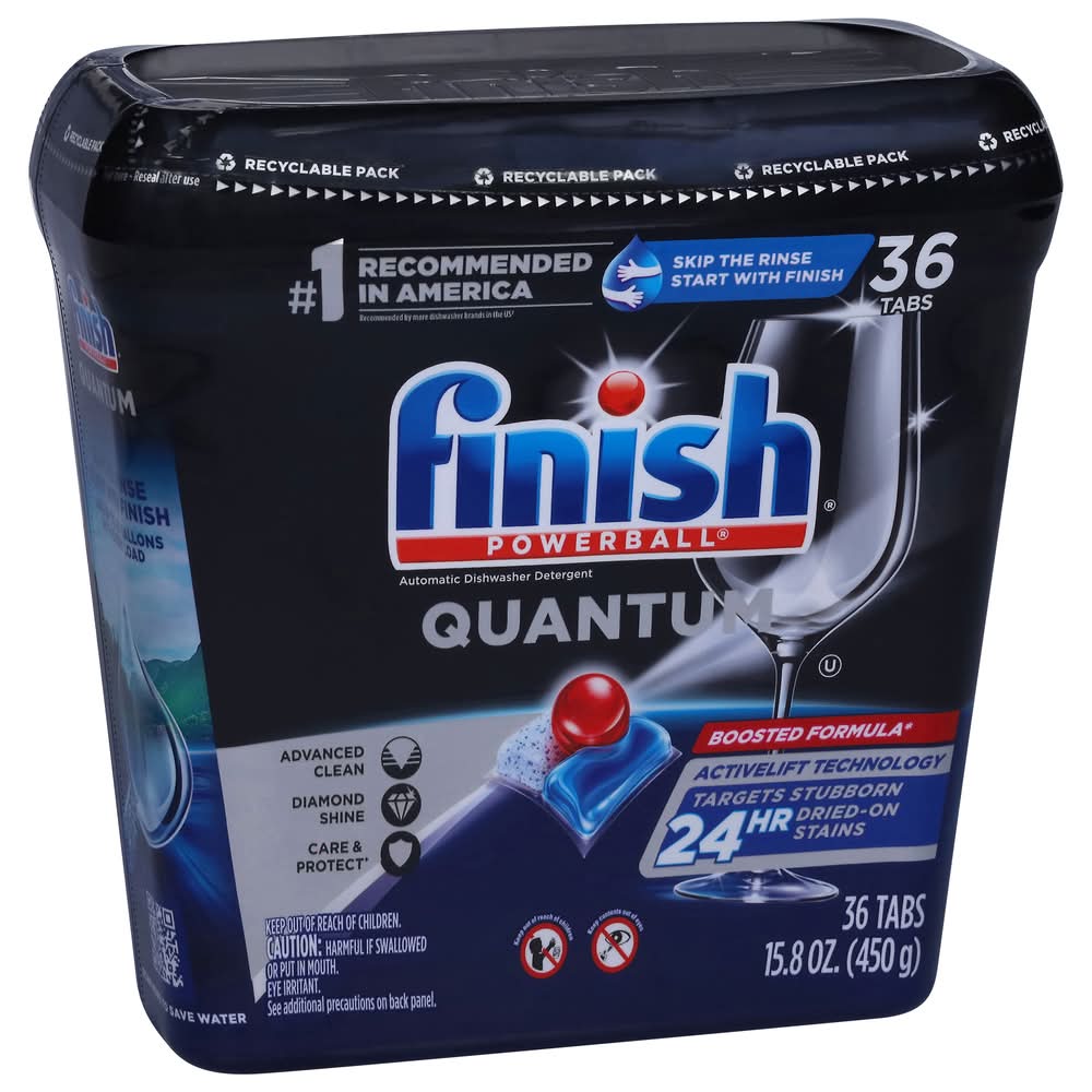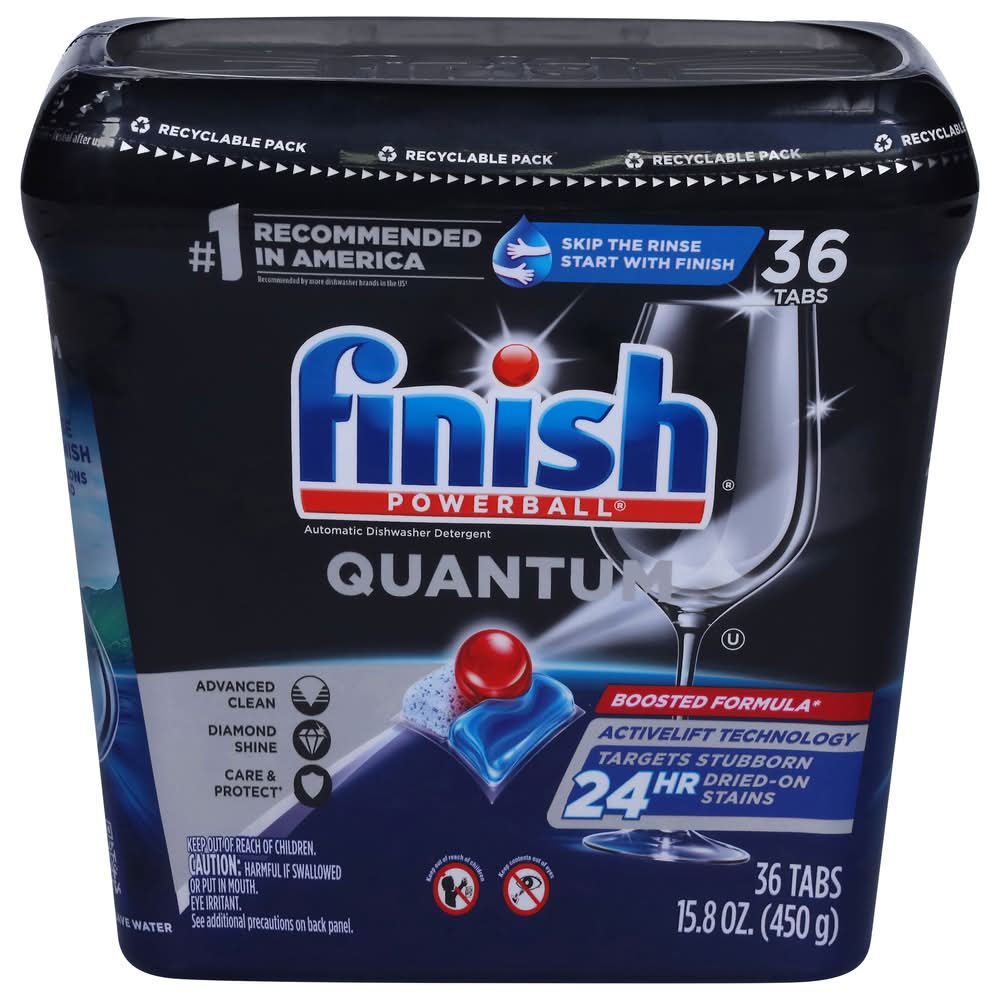 No. 1 recommended in America. Recommended by more dishwasher brands worldwide. Skip the rinse, start with finish. Advanced clean. Diamond shine. Care & protect. Boosted formula. Activelift technology. Targets stubborn 24 h dried-on stains. Wrapper-free, water-soluble film. Finish Quantum, for our ultimate clean & diamond shine 1st time, every time. Its advanced chemistry with Activelift Technology is effective at breaking down all types of food residues, without pre-rinsing. The tabs protect and care for your glassware wash after wash and helps them maintain their shine. Our ultimate performance with 15% less chemical weight than Finish Classic pressed powder tablets (Vs Finish Classic). 3 steps for perfect results. For drying & spot prevention. For a hygienically clean dishwasher. Nothing but dishwashing expertise inside. Free from chlorine bleach. Not for retail sale. Save up to 20 gallons with every load. Packaging: Reusable