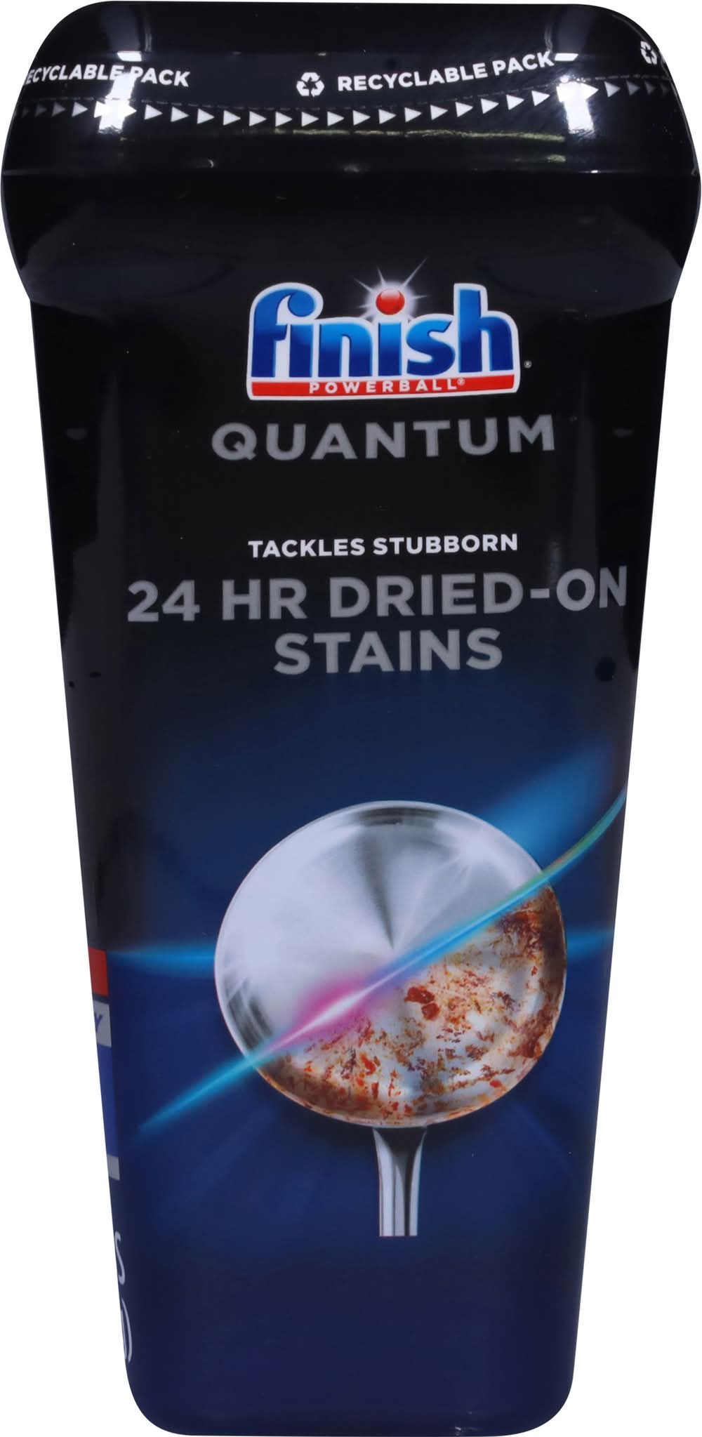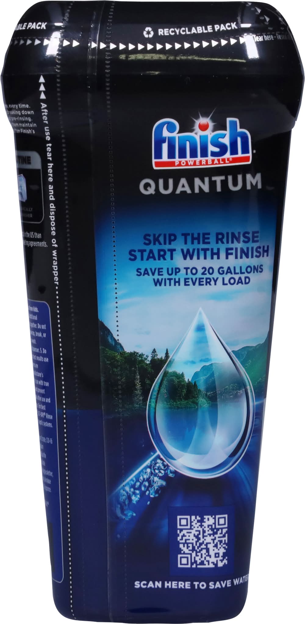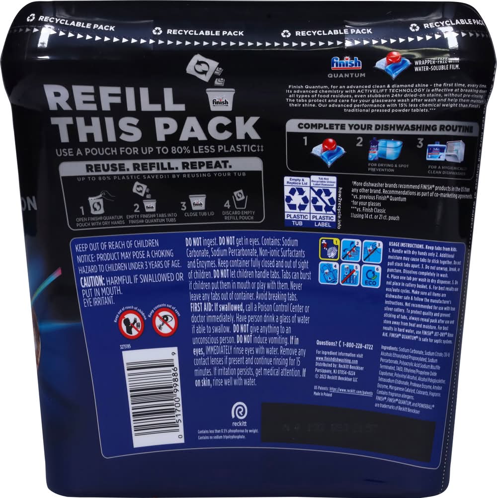 No. 1 recommended in America. Recommended by more dishwasher brands worldwide. Skip the rinse, start with finish. Advanced clean. Diamond shine. Care & protect. Boosted formula. Activelift technology. Targets stubborn 24 h dried-on stains. Wrapper-free, water-soluble film. Finish Quantum, for our ultimate clean & diamond shine 1st time, every time. Its advanced chemistry with Activelift Technology is effective at breaking down all types of food residues, without pre-rinsing. The tabs protect and care for your glassware wash after wash and helps them maintain their shine. Our ultimate performance with 15% less chemical weight than Finish Classic pressed powder tablets (Vs Finish Classic). 3 steps for perfect results. For drying & spot prevention. For a hygienically clean dishwasher. Nothing but dishwashing expertise inside. Free from chlorine bleach. Not for retail sale. Save up to 20 gallons with every load. Packaging: Reusable