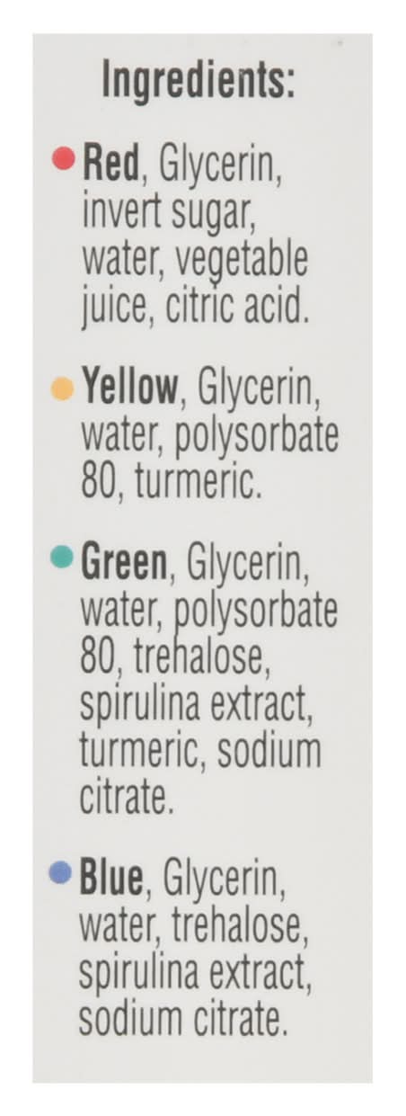 Ingredients: Red: Glycerin, Invert Sugar, Water, Vegetable Juice, Citric Acid, Yellow: Glycerin Water, Polysorbate 80, Turmeric, Green: Glycerin, Water, Polysorbate 80, Trehalose, Spirulina Extract, Turmeric, Sodium Citrate, Blue: Glycerin, Water, Trehalose, Spirulina Extract, Sodium Citrate