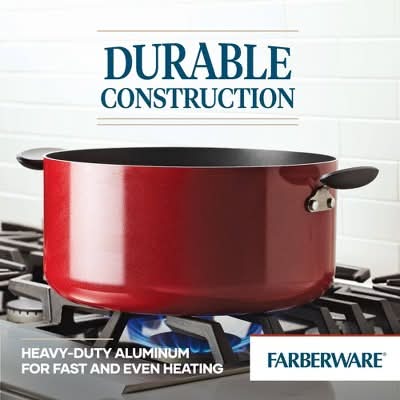 Farberware® Cookware always combines stylish construction with great cooking results, and the Farberware Aluminum Nonstick 10.5-Quart Covered Stockpot is no exception. Aluminum construction helps this Farberware® stockpot heat quickly and evenly from base to rim, and the long-lasting Diamond nonstick interior provides beautiful food release for seared sirloin cubes, browned chicken, and all the other delicious ingredients in homemade soups and stocks. The chili pot capacity is generous enough for a large batch of the family's favorite stew or soup for a local picnic or potluck. A shatter-resistant glass lid helps hold the heat and moisture inside the covered pot and keeps the cooking visible for reducing broths and other liquids. The double-riveted side handles are solid for plenty of support and leverage when moving or pouring from the filled pot. Conveniently oven safe to 350°F, this stockpot is dishwasher safe for easy cleaning convenience. Every kitchen needs a sizeable stockpot for stews, soups and more, and the recipe truly begins with the Farberware® Aluminum Nonstick 10.5-Quart Stockpot. Farberware: The Most Trusted Cookware Brand in America Voted Most Trusted Cookware Brand by American shoppers based on the 2022 Brandspark(r) American Trust study Color: Red