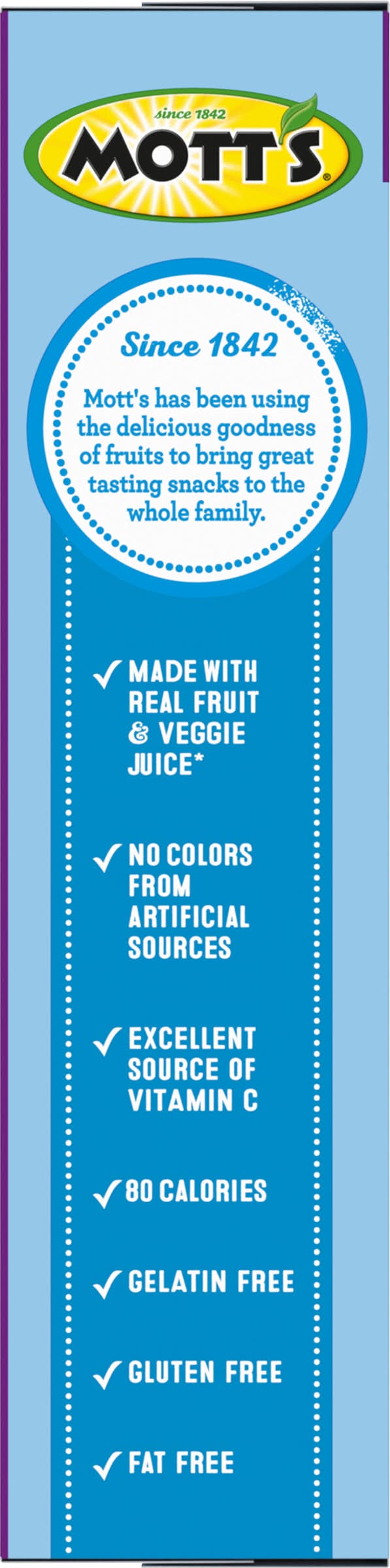 When you need a tasty snack for kids of all ages, choose the juicy taste of Mott's Assorted Fruit Flavored Snacks! Not only are these bite-sized gummies delicious, but they are also made with real fruit and veggie juice. These gluten free fruit flavored snacks have 60% daily value of vitamin C per serving. They're gluten free, gelatin free, fat free, and have no colors from artificial sources. You've found the perfect after school snack that's a win for you and your kids! Individual pouches provide convenience on the go. Reach for Mott's Assorted Fruit Flavored Snacks pouches as a treat the whole family can enjoy. This value pack contains 22 assorted fruit flavored snack pouches in total. These fruit-flavored snacks are made with pear, apple, and carrot juice concentrates. See nutritional panel on the box for a complete list of ingredients. They are not intended to replace fruit or vegetables in the diet. • Flavor: Assorted • Pack size: 22 • General mills sales, inc., Minneapolis,MN, 55440, USA • Packaging: Reusable