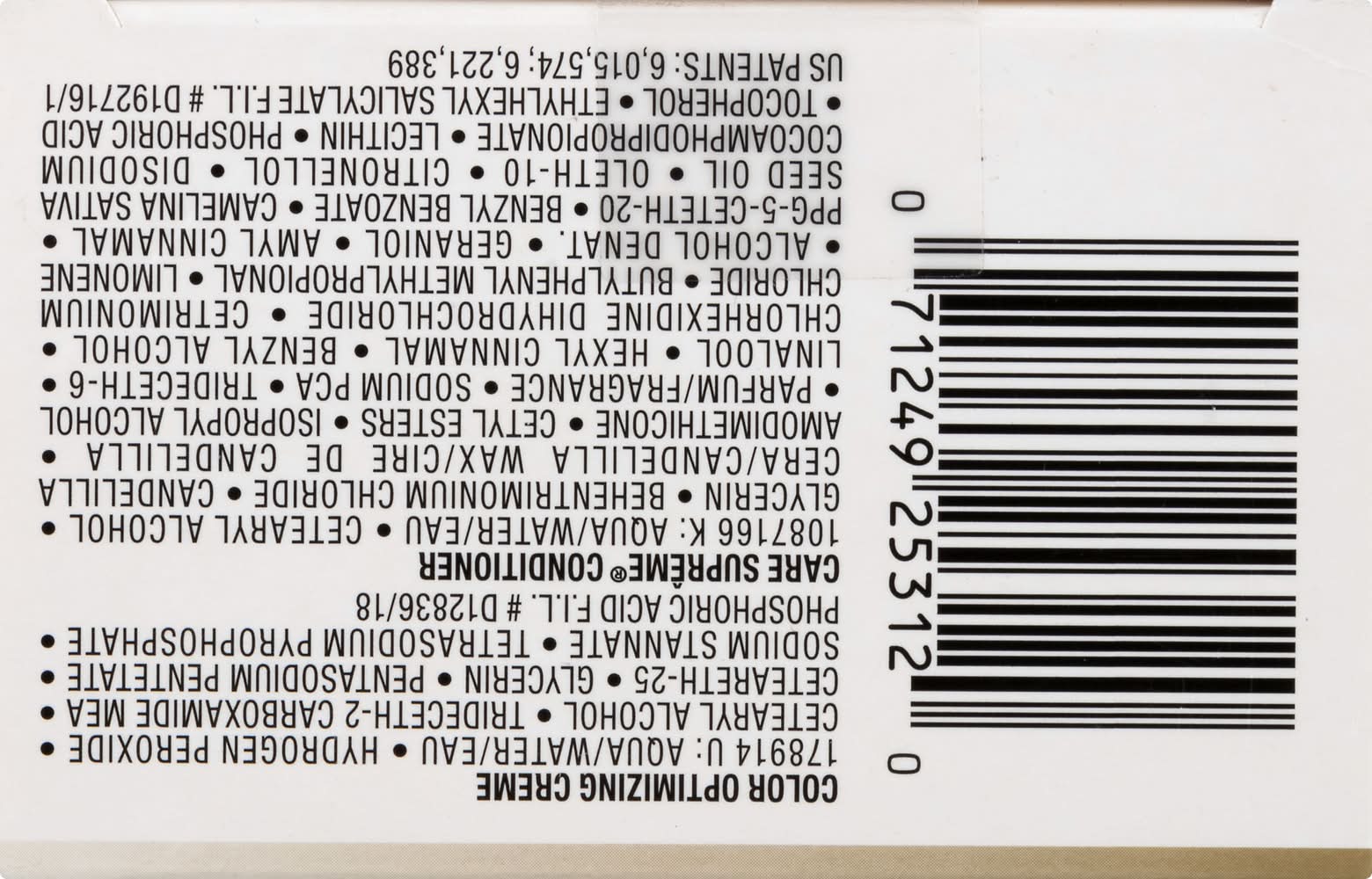 Ingredients: Color Gel: 1055895: Aqua/Water/Eau, Trideceth-2 Carboxamide MEA, Propylene Glycol, Hexylene Glycol, PEG-2 Oleamine, Polyglyceryl-4 Oleyl Ether, Oleyl Alcohol, Alcohol Denat, Ammonium Hydroxide, Polyglyceryl-2 Oleyl Ether, Oleic Acid, Sodium Diethylaminopropyl Cocoaspartamide, Pentasodium Pentetate, Ammonium Acetate, Parfum/Fragrance, Sodium Metabisulfite, P-Aminophenol, 2-Methyl-5- Hydroxyethylaminophenol, 4-Amino-2-Hydroxytoluene, Erythorbic Acid, P-Phenylenediamine, 2-Amino-3-Hydroxypyridine, M-Aminophenol, Resorcinol, Alpha-Isomethyl Ionone, Eugenol, Linalool, Citronellol. Color Optimizing Creme: 178914 U: Aqua/Water/Eau, Hydrogen Peroxide, Cetearyl Alcohol, Trideceth-2 Carboxamide MEA, Ceteareth-25, Glycerin, Pentasodium Pentetate, Sodium Stannate, Tetrasodium Pyrophosphate, Phosphoric Acid. Care Supreme Conditioner: 1087166 K: Aqua/Water/Eau, Cetearyl Alcohol, Glycerin, Behentrimonium Chloride, Candelilla Cera/Candelilla Wax, Amodimethicone, Cetyl Esters, Isopropyl Alcohol, Parfum/Fragrance, Sodium PCA, Trideceth-6, Linalool, Hexyl Cinnamal, Benzyl Alcohol, Chlorhexidine Dihydrochloride, Cetrimonium Chloride, Butylphenyl Methylpropional, Limonene, Alcohol Denat, Geraniol, Amyl Cinnamal, PPG-5-Ceteth-20, Benzyl Benzoate, Camelina Sativa Seed Oil, Oleth-10, Citronellol, Disodium Cocoamphodipropionate, Lecithin, Phosphoric Acid, Tocopherol, Ethylhexyl Salicylate