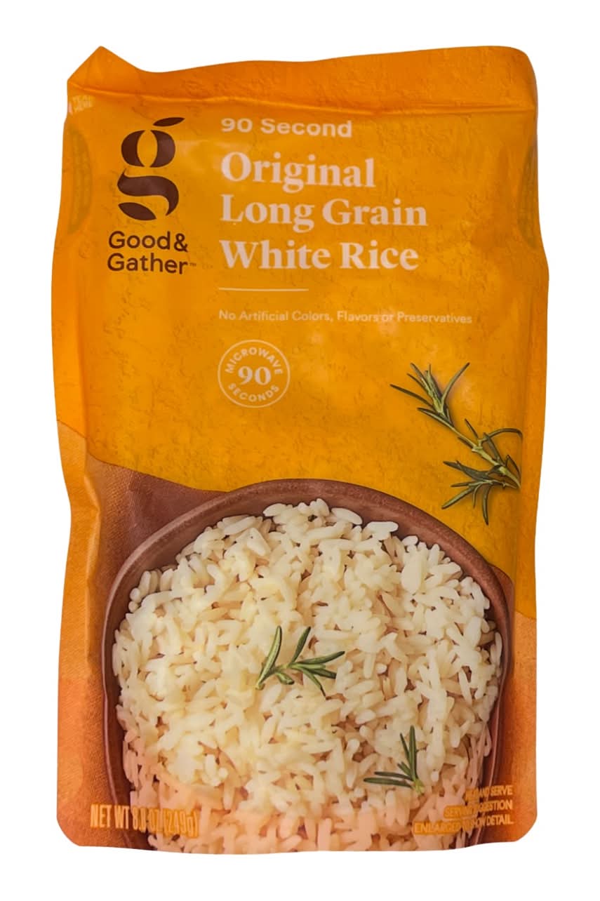Waste no time in the kitchen or on your lunch break with the 90 Second Original Long Grain White Rice from Good & Gather™. This delicious white rice comes in a convenient pouch that greatly reduces prep and cleanup time, making it perfect for a quick lunch at the office or meal prepping for the week — it’s ready to serve after just 90 seconds in the microwave. Delicious as is, this rice also makes for a perfect companion with steamed or grilled veggies, or you can add a little protein like chicken or beef for a complete entree everyone will love. Every product that carries the Good & Gather name starts with quality ingredients that deliver great taste, making it easier for you and your family to eat well, every day. We promise you’ll love each bite, or your money back.