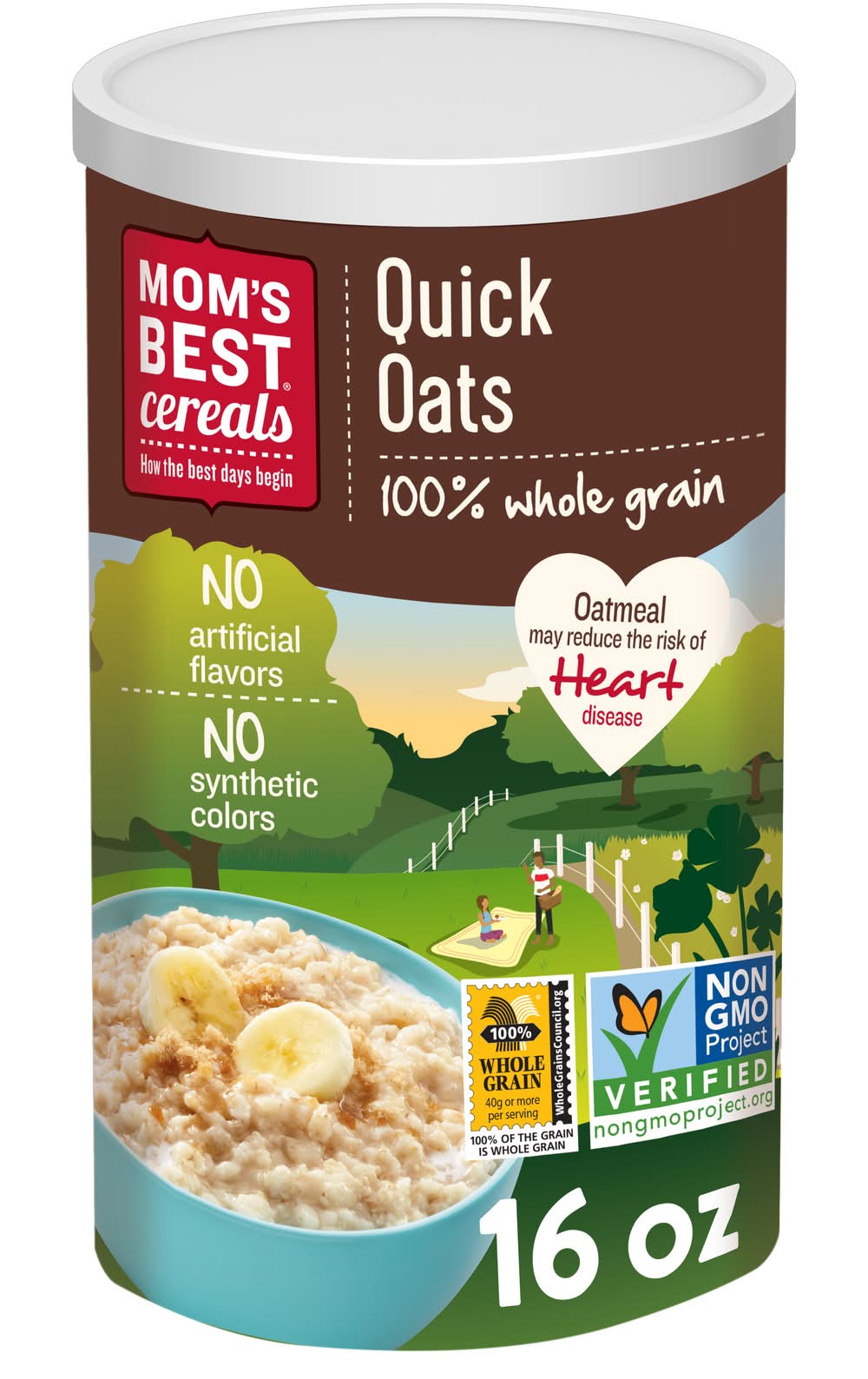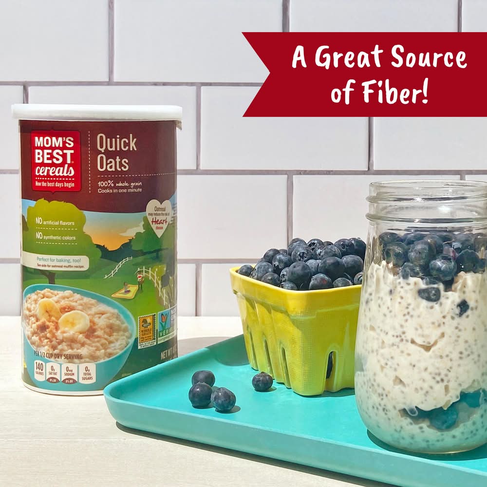 Mom's Best Quick Oats offer a great tasting hot cereal for families that want honest-to-goodness ingredients in their breakfast cereal at an affordable price. Mom's Best Quick Oats are a good source of fiber and contain 40 grams of 100 percent whole grain oats per serving. They contain no artificial flavors and no artificial preservatives. This classic, whole grain quick oatmeal cooks in 1 minute for a fast, heart-healthy (1) option at breakfast time.