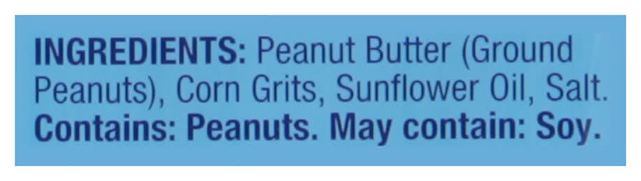 Ingredients: Peanut Butter (Ground Peanuts), Corn Grits, Sunflower Oil, Salt Contains: Peanuts, Soybeans