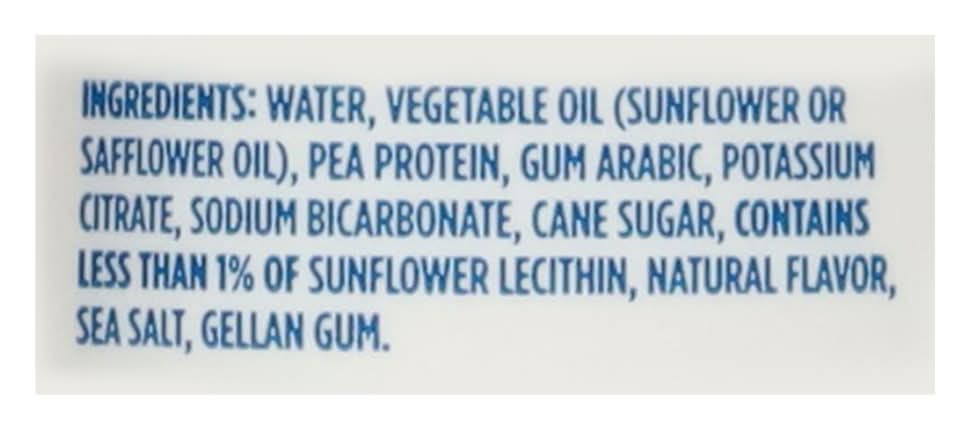 Ingredients: Water, Vegetable Oil (Sunflower or Safflower Oil), Pea Protein, Gum Arabic, Potassium Citrate, Sodium Bicarbonate, Cane Sugar, Contains Less than 1% of Sunflower Lecithin, Natural Flavor, Sea Salt, Gellan Gum