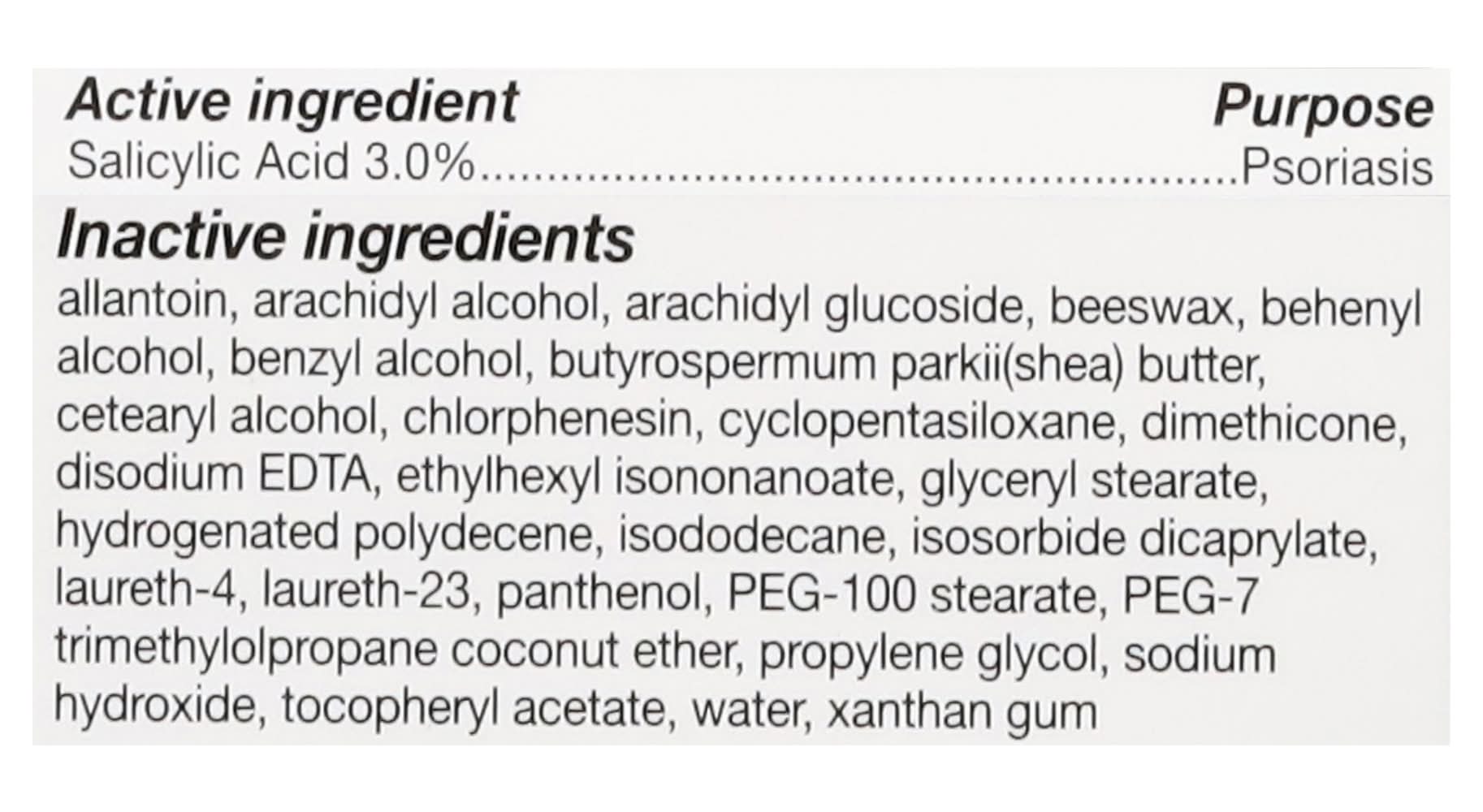 Ingredients: Active Ingredients: Salicylic Acid (3.0 %), Psoriasis. Inactive Ingredients: Allantoin, Arachidyl Alcohol, Arachidyl Glucoside, Beeswax, Behenyl Alcohol, Benzyl Alcohol, Butyrospermum Parkii (Shea) Butter, Cetearyl Alcohol, Chlorphenesin, Cyclopentasiloxane, Dimethicone, Disodium EDTA, Ethylhexyl Isononanoate, Glyceryl Stearate, Hydrogenated Polydecene, Isododecane, Isosorbide Dicaprylate, Laureth-4, Laureth-23, Panthenol, PEG-100 Stearate, PEG-7 Trimethylolpropane Coconut Ether, Propylene Glycol, Sodium Hydroxide, Tocopheryl Acetate, Water, Xanthan Gum Contains: Tree Nuts, Sheanuts
