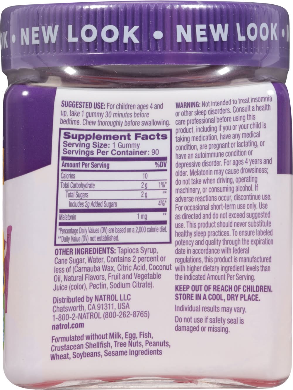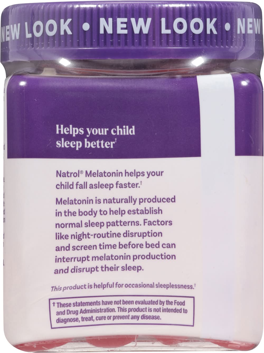 Natrol® Kids 1 mg Melatonin Gummies provide a safe, effective and great-tasting option to help your child fall asleep faster and wake up refreshed for the day ahead.* These sleep gummies are 100% drug-free, made with clean ingredient, no synthetic dyes, artificial flavors or sweeteners. The vegetarian, non-GMO and gelatin-free melatonin gummies for kids exclude common food allergens. Formulated with gentle melatonin 1 mg, these sleep supplements are helpful for occasional sleeplessness in children ages four and up.* Natrol LLC, Chatsworth, CA, 91311, Ph: 800-2-NATROL