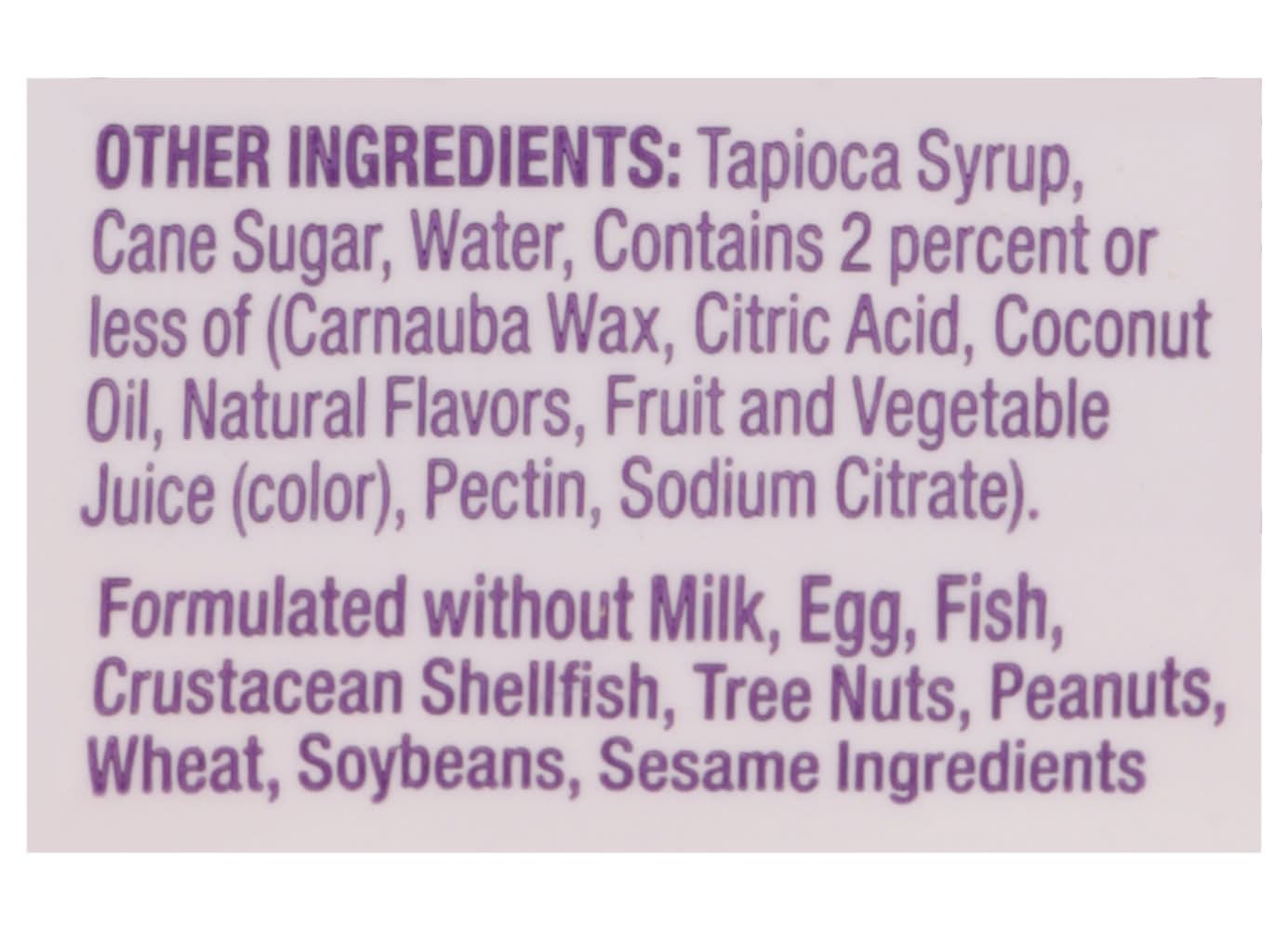 Ingredients: Other Ingredients: Tapioca Syrup, Cane Sugar, Water, Contains 2 Percent or Less of (Carnauba Wax, Citric Acid, Coconut Oil, Natural Flavors, Fruit and Vegetable Juice (Color), Pectin, Sodium Citrate) Contains: 'Tree Nuts Contains', 'Peanuts May Contain', 'Soybeans May Contain', 'Milk Free From', 'Eggs Free From', 'Fish Free From', 'Crustacean Shellfish Free From', 'Tree Nuts Free From', 'Gluten Free From', 'Peanuts Free From', 'Wheat Free From', 'Soybeans Free From'