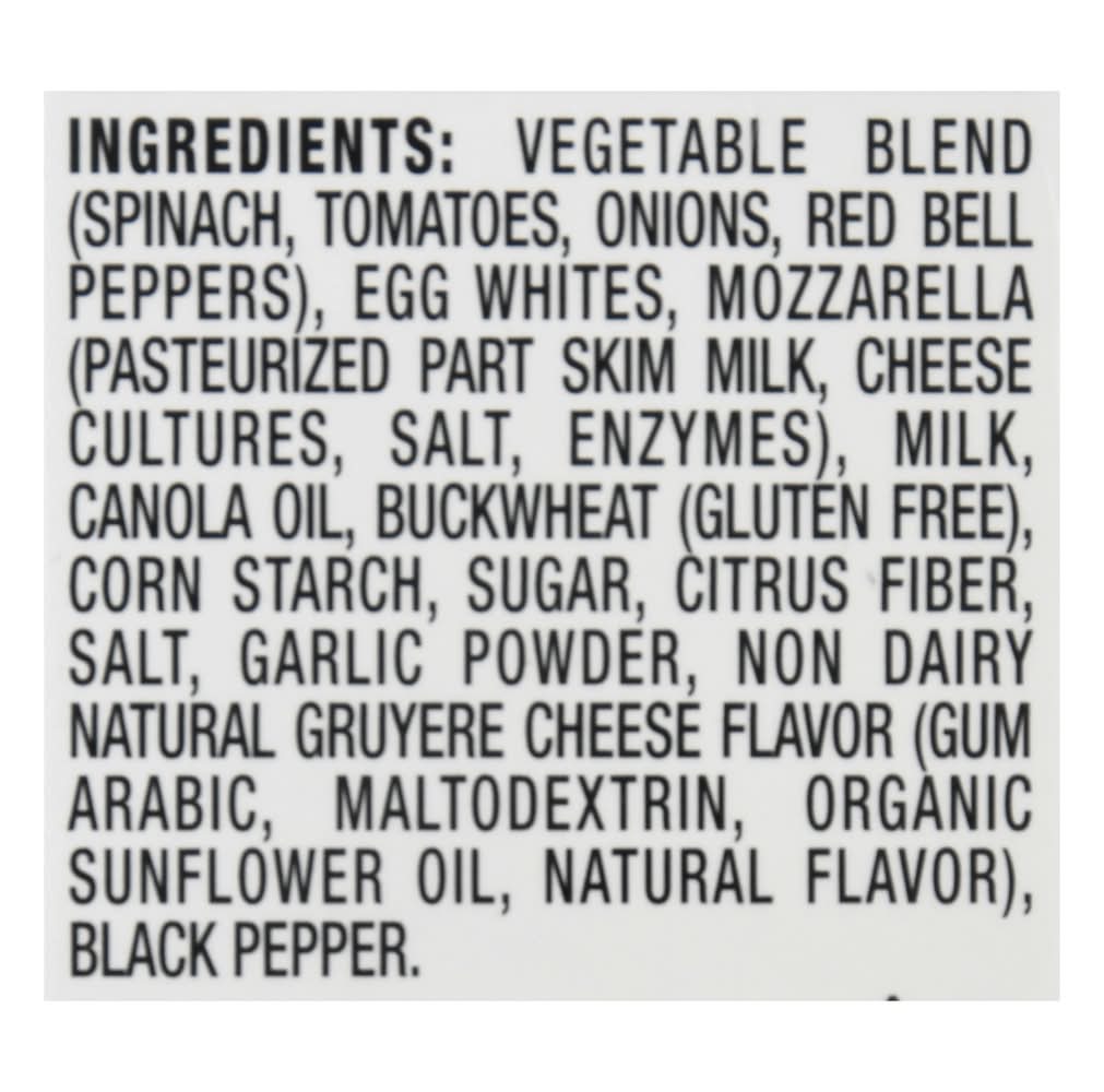 Ingredients: Vegetable Blend (Spinach, Tomatoes, Onions, Red Bell Peppers), Egg Whites, Mozzarella (Pasteurized Part Skim Milk, Cheese Cultures, Salt, Enzymes), Milk, Canola Oil, Buckwheat (Gluten Free), Corn Starch, Sugar, Citrus Fiber, Salt, Garlic Powder, Non-Dairy Natural Gruyere Cheese Flavor (Gum Arabic, Maltodextrin, Organic Sunflower Oil, Natural Flavor), Black Pepper Contains: Eggs, Milk, Wheat, Corn