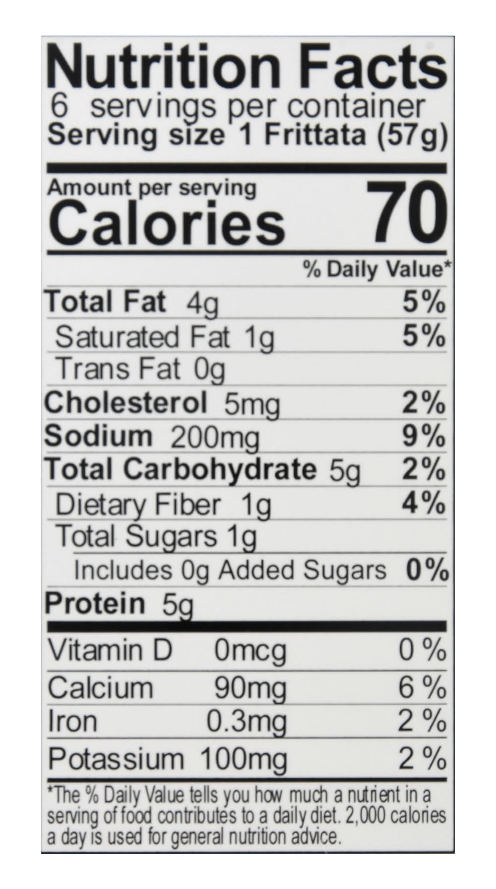 Oven/toaster oven (recommended): pre-heat oven to 350 degrees f. remove frittata(s) from all packaging. place frittata(s) on a baking sheet and heat for approximately 18 minutes. microwave: heat in bag on high for approximately 45 seconds. caution: bag will be hot! microwave times are based on a 1000 watt oven and may vary due to wattage. heat product until the internal temperature reaches 165 degrees f. keep frozen.