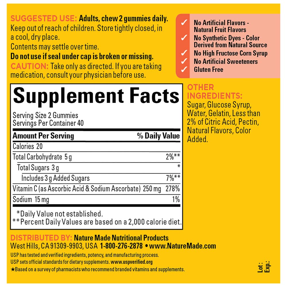 Nature Made Vitamin C 250 mg per serving gummies are Vitamin C supplements that help support immune health, provide antioxidant support, and aid in iron absorption. Sourced from high-quality ingredients, these delicious tangerine-flavored Vitamin C gummies for adults are dietary supplements that are made with pectin and have no artificial flavors, no synthetic dyes, no high fructose corn syrup, no artificial sweeteners, and are gluten free. Vitamin C is an antioxidant that helps support your immune system and is needed for collagen synthesis to support overall skin health. If you are not receiving enough Vitamin C from your daily diet or taking a Vitamin C supplement, then a Nature Made Vitamin C 250mg per serving antioxidant supplement can help. Nature Made's gummy Vitamin C for adults offers a delicious way to take your Vitamin C if you don't prefer tablets or softgels. Adults, chew two of these Nature Made Vitamin C gummies daily. Nature Made supplements are quality you can trust. *Based on a survey of pharmacists who recommend branded vitamins and supplements.CAUTION: If you are taking medication, consult your physician before use.These statements have not been evaluated by the Food and Drug Administration. This product is not intended to diagnose, treat, cure, or prevent any disease. • Nature Made Nutritional Products, West Hills, CA, 91309-9903 • Packaging: Reusable