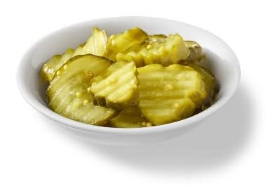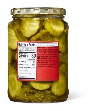 Add complex flavor and delicious crunch to a variety of dishes with these tasty Bread and Butter Chips from market pantry™. This 24-ounce jar of bread and butter pickles is great to keep on hand for topping burgers and other savory sandwiches, as well as for eating on snacking occasions like when you put together a charcuterie board with meats and cheeses. The sweet and tangy pickles come in thin circular shapes with a crinkle-cut texture, and the resealable jar makes it easy to use just as many as you need while saving the rest for later.