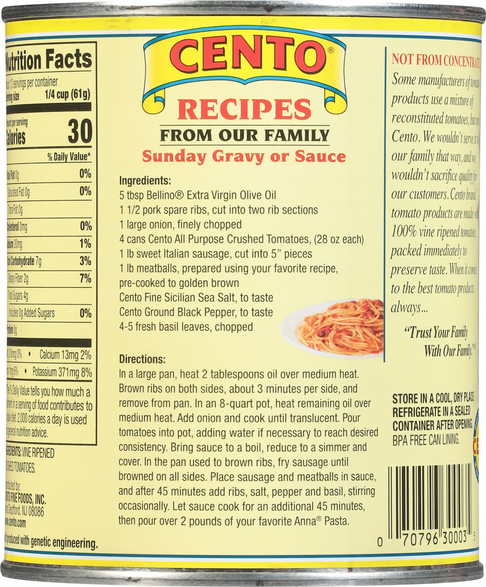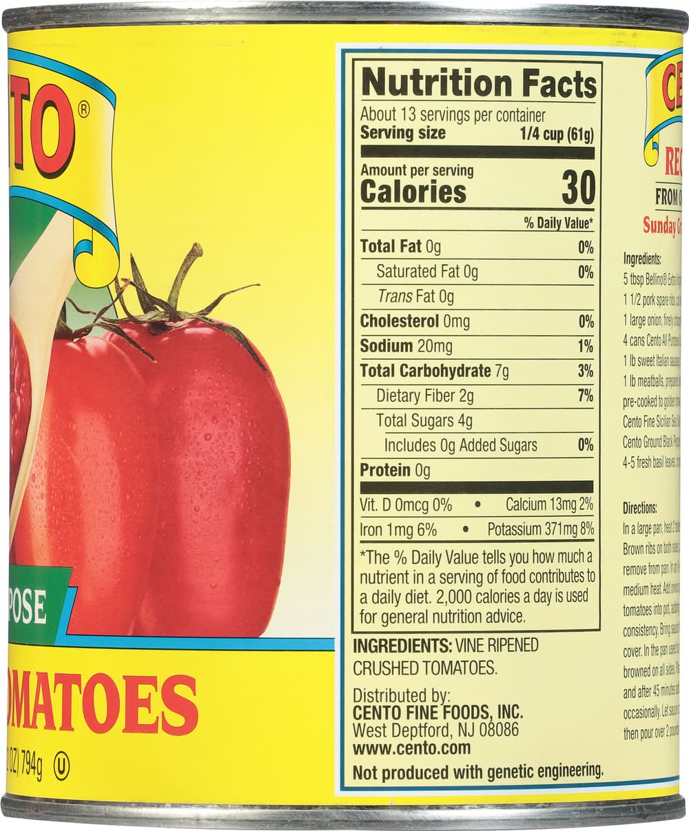 Make your supper fresh with these vine ripened Cento Crushed Tomatoes that come straight from the farms Cento. All natural with only the fragrant aroma of nature, these tomatoes are filled with vitamins and essential minerals for your body. The air-tight container ensures you get the same freshness and nutrients of fresh tomatoes no matter when you enjoy them. Cento Fine Foods, Inc., West Deptford, NJ.