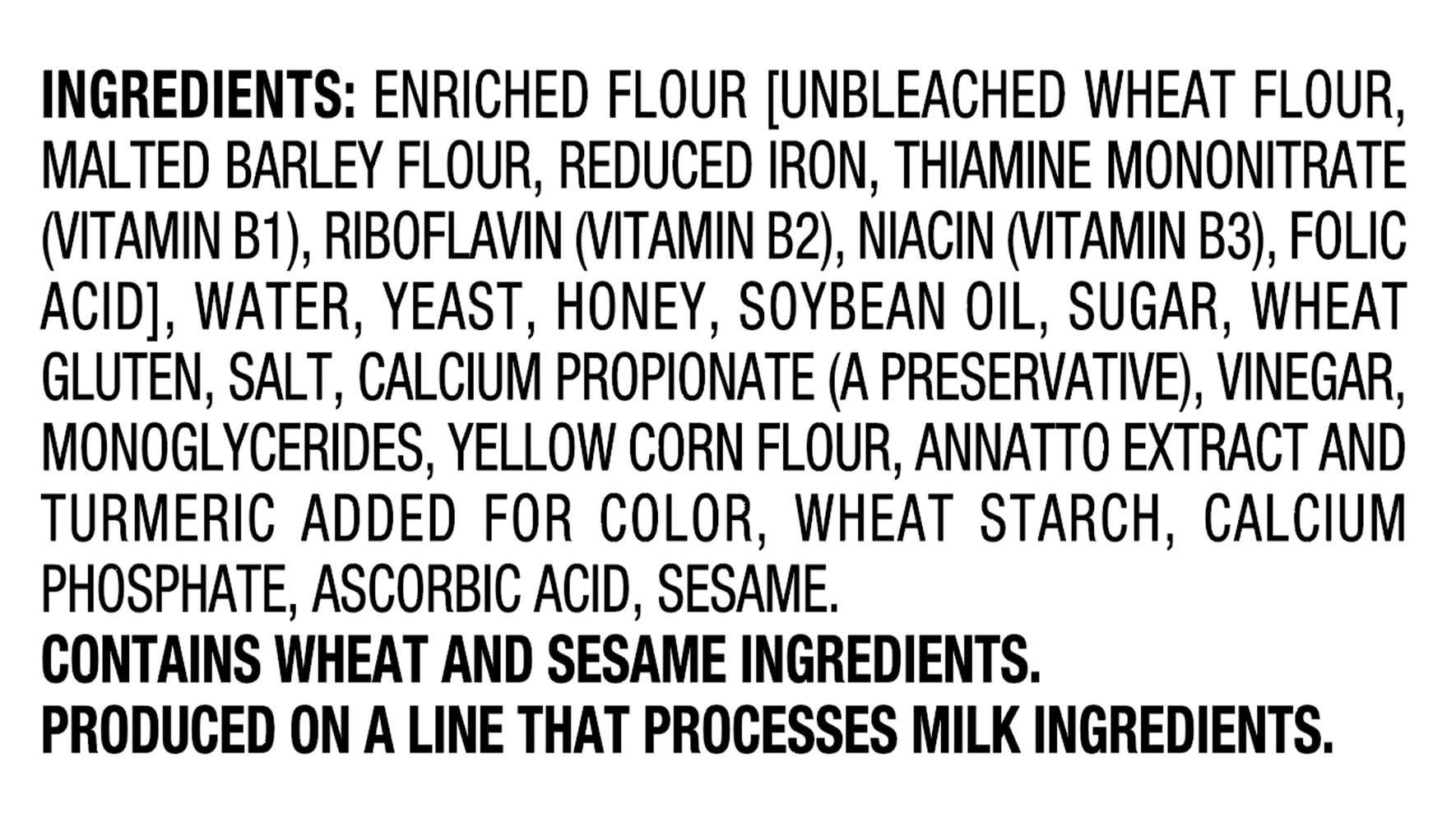 Ingredients: Enriched Flour [Unbleached Wheat Flour, Malted Barley Flour, Reduced Iron, Thiamine Mononitrate (Vitamin B1), Riboflavin (Vitamin B2), Niacin (Vitamin B3), Folic Acid], Water, Yeast, Honey, Soybean Oil, Sugar, Wheat Gluten, Salt, Calcium Propionate (a Preservative), Vinegar, Monoglycerides, Yellow Corn Flour, Annatto Extract and Turmeric Added for Color, Wheat Starch, Calcium Phosphate, Ascorbic Acid, Sesame Contains: Milk