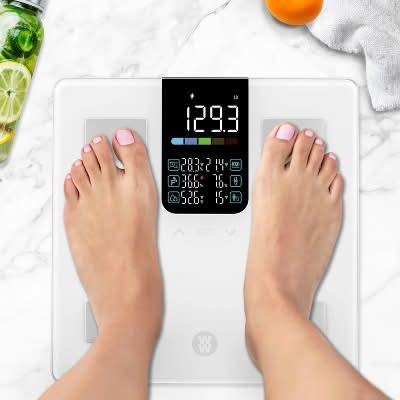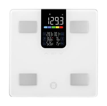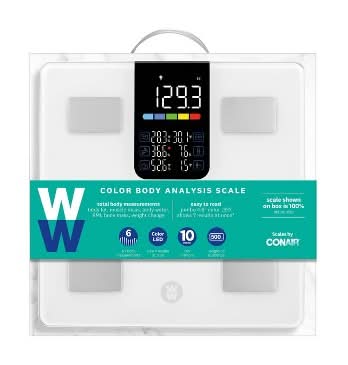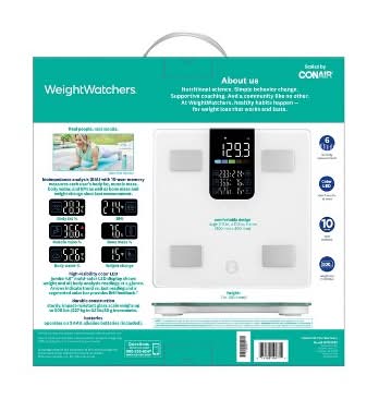 Transform your weight and wellness monitoring with the WW Scales by Conair Color Body Analysis Scale, where colorful display technology meets everyday convenience. This innovative body analysis scale features a color LED display that delivers 6 body analysis metrics, including body fat, muscle mass, body water, BMI, bone mass, and weight change. The high-visibility backlit color display, with its jumbo 4.6" screen, allows for easy and clear results. Display arrows and a segmented color bar also provide at-a-glance BMI feedback and help you monitor trends since the last reading. Designed for both functionality and durability, this scale features a spacious 11.8" x 11.8" platform, comfortable and stable for users. It supports up to 500 lb. and is built with impact-resistant glass, ensuring long-lasting use even with daily operation. The bio-impedance analysis (BIA) function, combined with 10-user memory, offers personalized results for every member of the family. Battery operated and easy to use, simply step on the scale to activate it. With its 10-year warranty, this WW Scales by Conair scale provides precision, reliability, and a stylish addition to your wellness routine, helping you stay motivated and on track with your health goals.