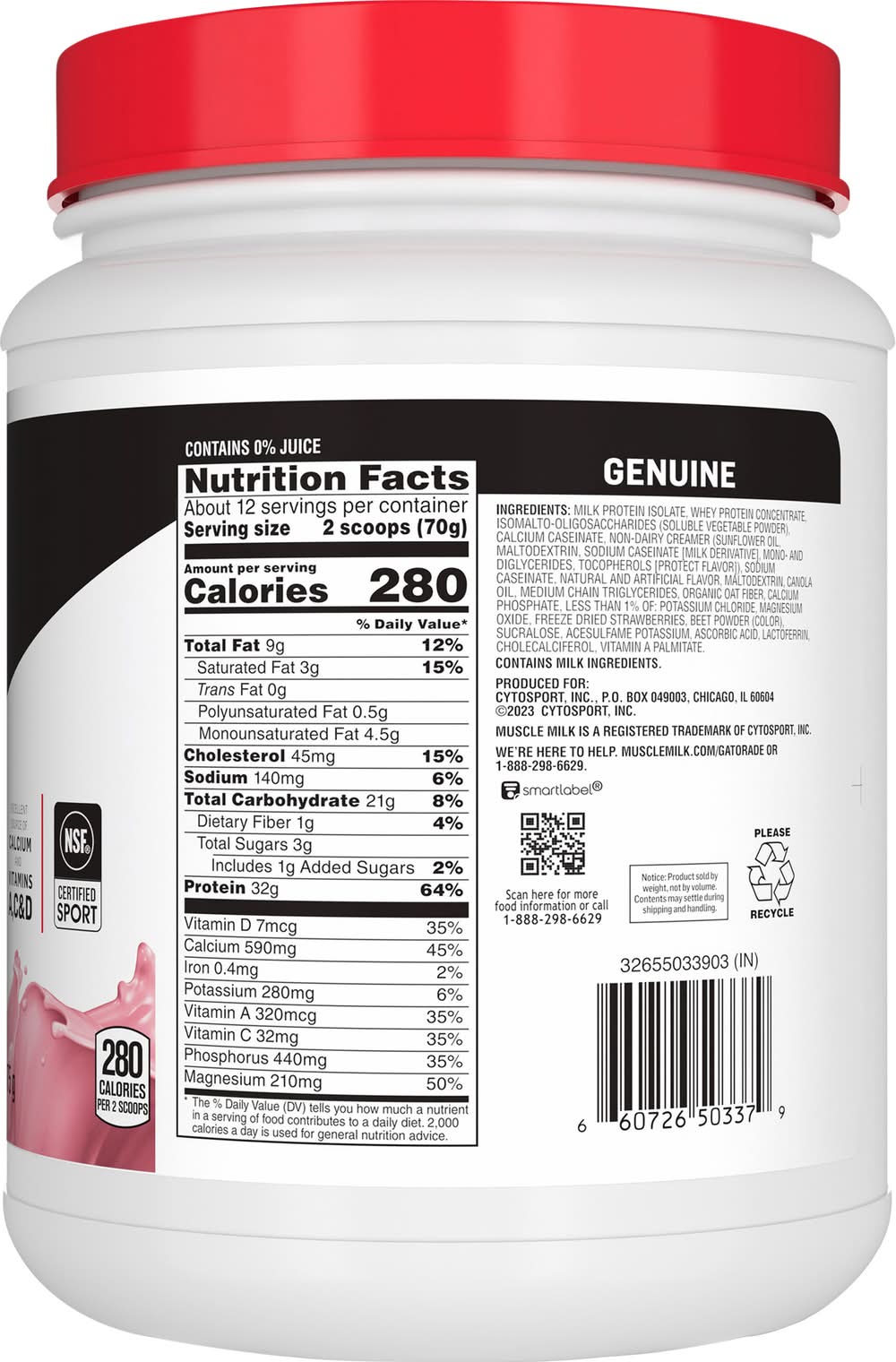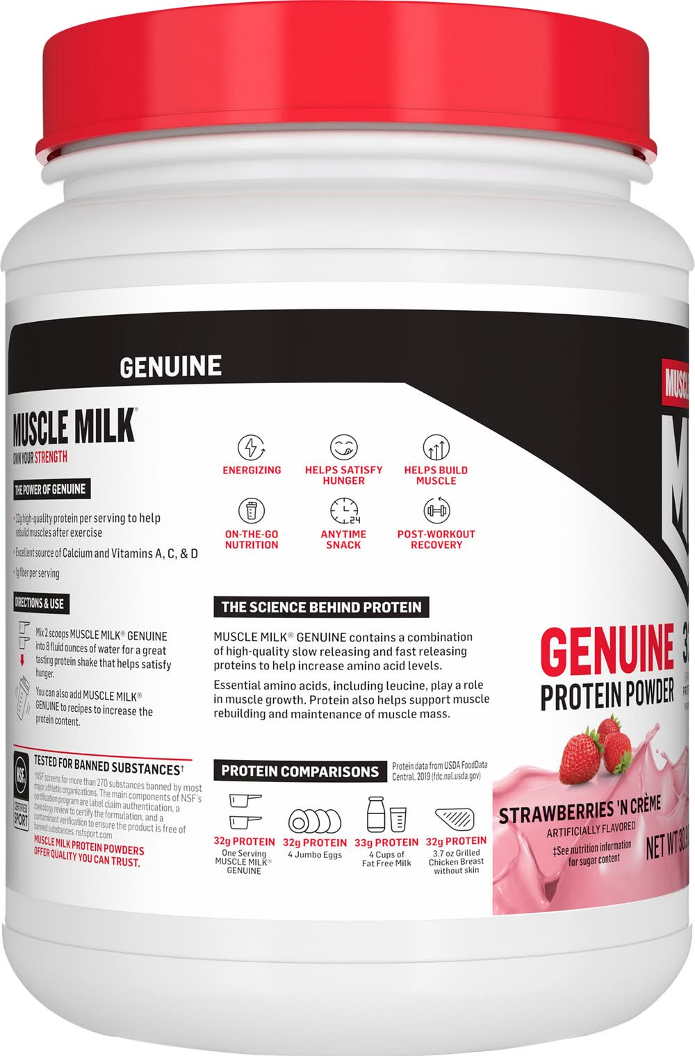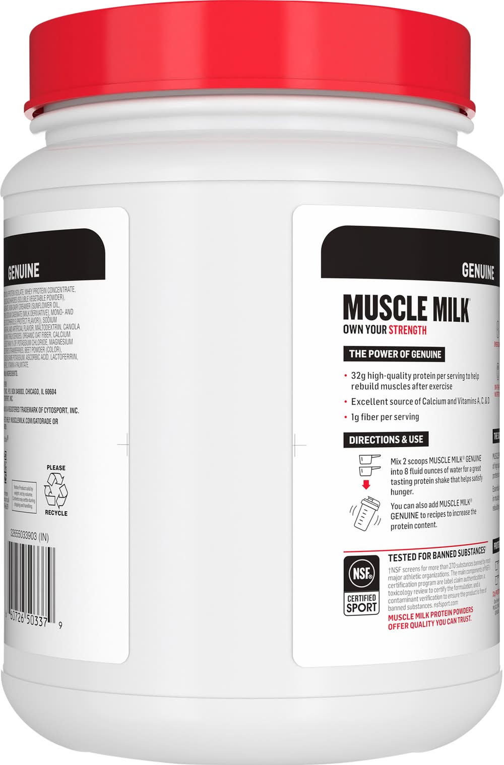 32 high-quality protein per serving to help rebuild muscles after exercise. Protein Comparisons: Protein data from USDA Food Data Central, Muscle Milk Genuine contains a combination of high-quality slow releasing and fast releasing proteins to help increase amino acid levels. Essential amino acids, including leucine, play a role in muscle growth. Protein also helps support muscle rebuilding and maintenance of muscle mass. Muscle milk proteins powders offer quality you can trust. Notice: Product sold by weight, not by volume. Contents may settle during shipping and handling. • Cytosport, Inc., PO Box 049003, Chicago, IL, 60604 • Packaging: Reusable