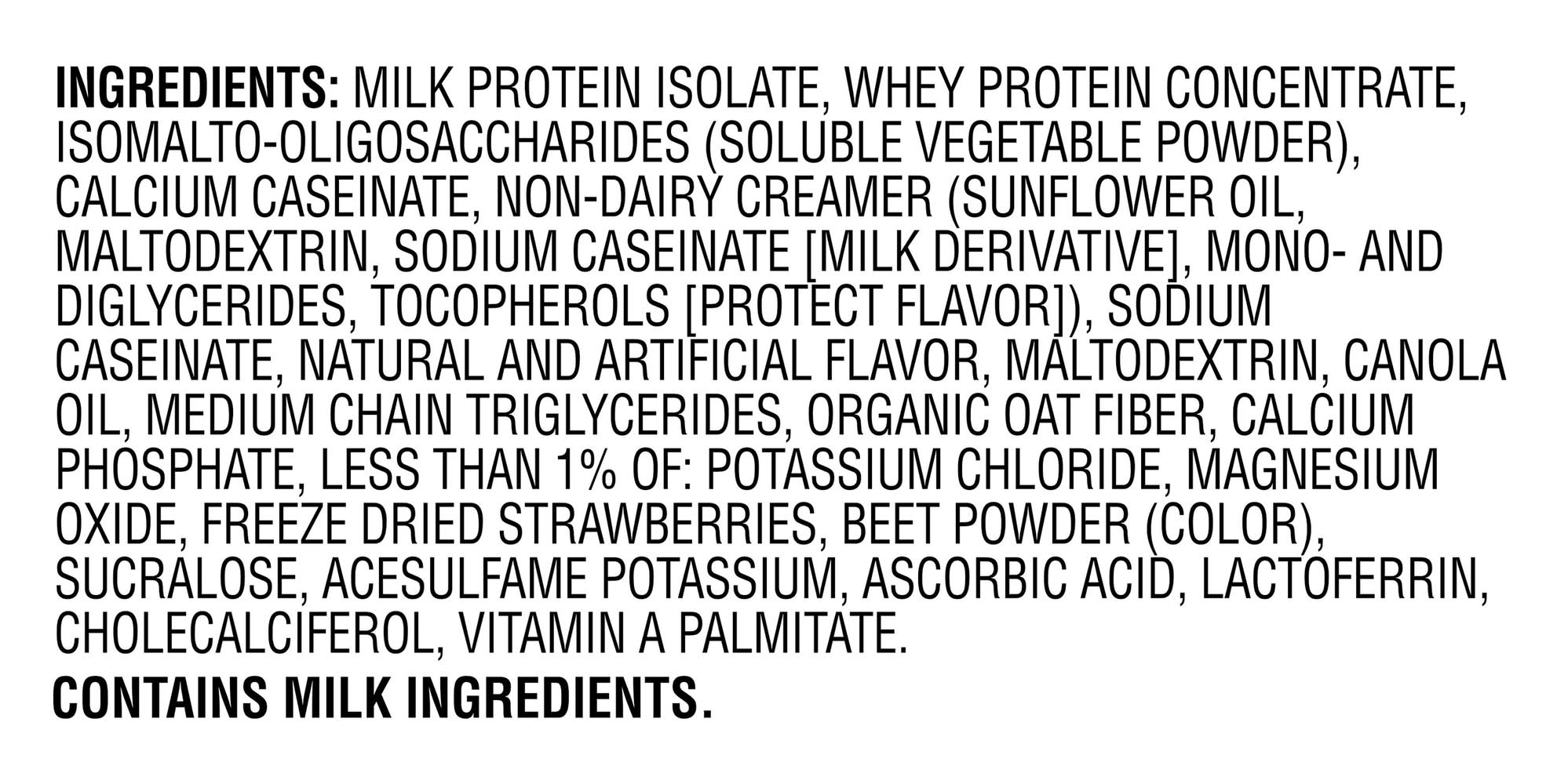 Ingredients: Milk Protein Isolate, Whey Protein Concentrate, Isomalto-Oligosaccharides (Soluble Vegetable Powder), Calcium Caseinate, Non-Dairy Creamer (Sunflower Oil, Maltodextrin, Sodium Caseinate [Milk Derivative], Mono-and Diglycerides, Tocopherols [Protect Flavor]), Sodium Caseinate, Natural and Artificial Flavor, Maltodextrin, Canola Oil, Medium Chain Triglycerides, Organic Oat Fiber, Calcium Phosphate, Less than 1% of: Potassium Chloride, Magnesium Oxide, Freeze Dried Strawberries, Beet Powder (Color), Sucralose, Acesulfame Potassium, Ascorbic Acid, Lactoferrin, Cholecalciferol, Vitamin A Palmitate Contains: Milk, Oat