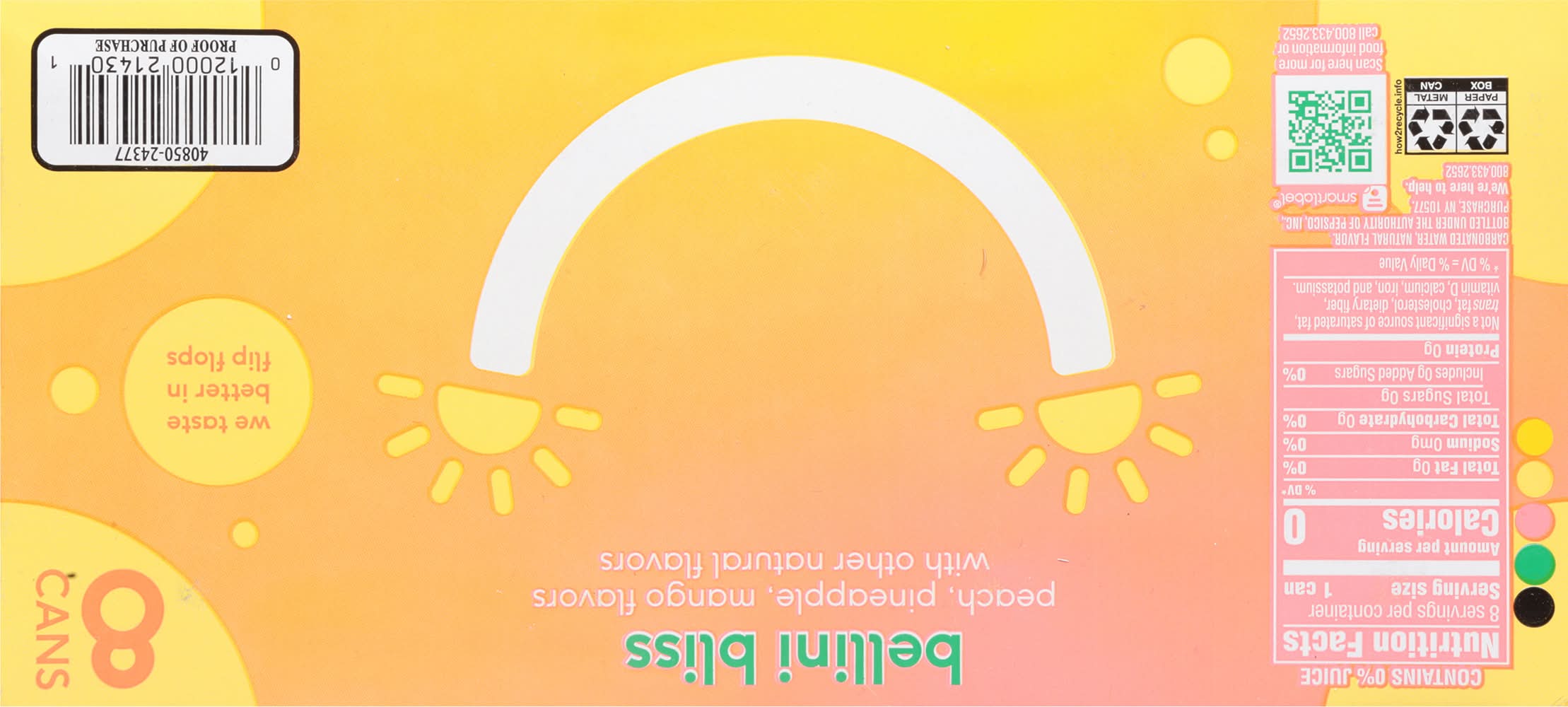 Peach, pineapple, mango flavors with other natural flavors. • Flavor: Bellini bliss • Pack size: 8