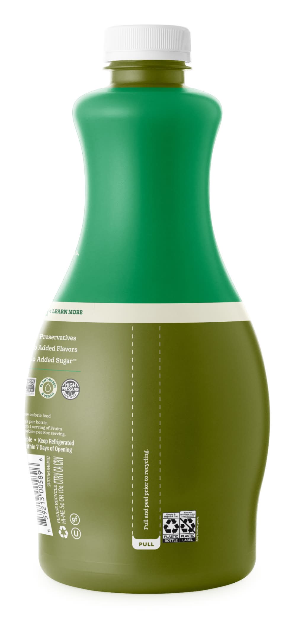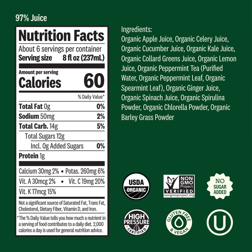 Ingredients: Organic Apple Juice, Organic Celery Juice, Organic Cucumber Juice, Organic Kale Juice, Organic Collard Greens Juice, Organic Lemon Juice, Organic Peppermint Tea (Purified Water, Organic Peppermint Leaf, Organic Spearmint Leaf), Organic Ginger Juice, Organic Spinach Juice, Organic Spirulina Powder, Organic Chlorella Powder, Organic Barley Grass Powder Contains: Barley, Celery