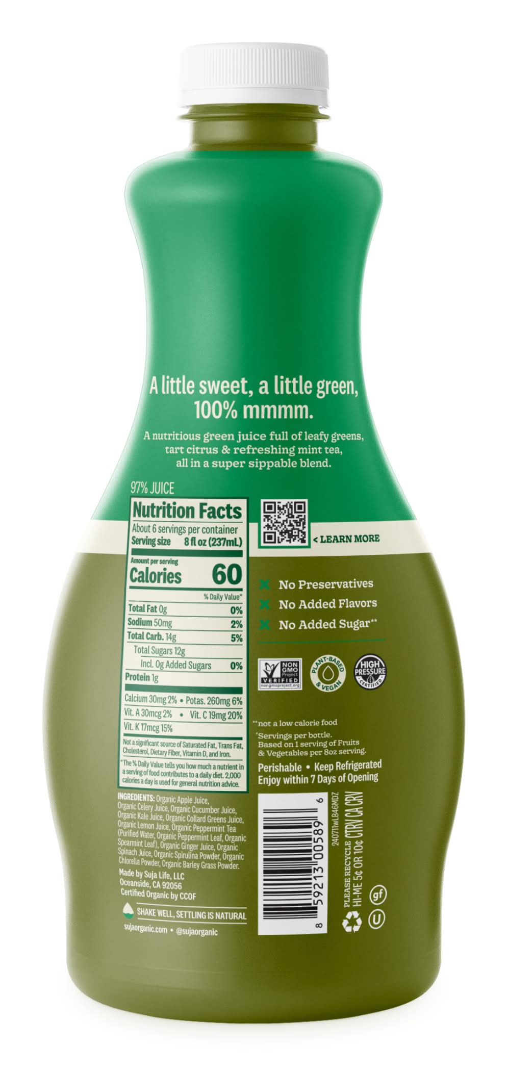 Is a little sweet, a little green and perfectly balanced. This green juice will have you feeling mighty good and mighty healthy with 5 servings of fruits and vegetables per 46 fl oz bottle. Full of organic cold pressed juice from fruits and vegetables with no added sugar, this green juice is an excellent source of vitamin K and a good source of vitamin C. Mighty Dozen blends 12 earthy greens—including kale, spinach, collard greens, spirulina and chlorella with green apple, mint tea and a lemon and ginger zing for a nutritious organic juice. Make every sip count with Suja juice to give your body a nutrient boost with breakfast, at school, while traveling or post-workout. This juice is vegan, gluten free and non-GMO. Getting your greens feels good. And with Suja, you're getting your greens. • Flavor: Assorted • Packaging: Reusable