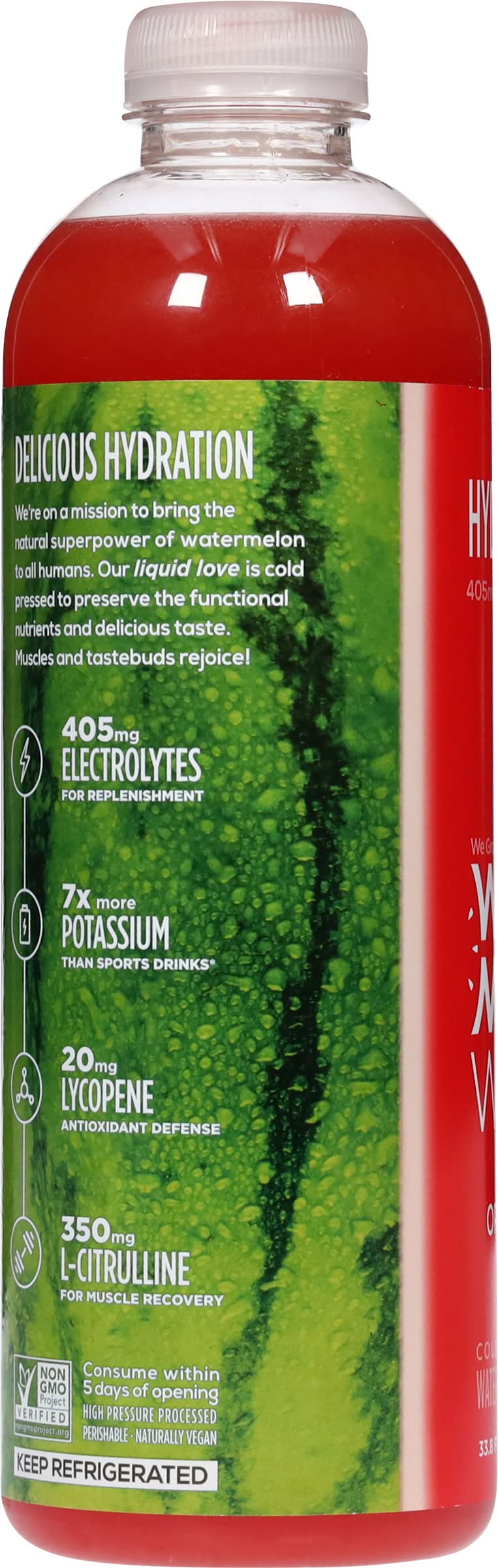 WTRMLN WTR is on a mission to bring the many powers of the watermelon superfruit to all humans in a way that supports local communities and farmers. We believe that mother nature has all the answers, and we aim to bring what she gives us to market in the purest way possible without losing the natural nutrients. Sourcing our melons from small farmers, we cold press the rind and flesh, add a touch of filtered water, and a squeeze of lime juice, and bottle it. That’s it! With superior hydration benefits and delicious taste, WTRMLN WTR naturally contains electrolytes and antioxidants to keep you hydrated and rejuvenated in the best way. Drink it for workouts, as an afternoon pick-me-up, or just to stay hydrated throughout the day! WTRMLN WTR Original Cold Pressed Juiced Watermelon Water, 12 Oz: DELICIOUS ALTERNATIVE TO OTHER PLANT BASED WATERS: Like coconut water, WTRMLN WTR is naturally low in sugar (45% less than leading juices), and packed with natural electrolytes, antioxidants and vitamins. But nothing beats the juicy taste of watermelon, and other waters lack the natural Lycopene and L-citrulline found in our tasty beverage. It's nature's perfect sports drink. GOOD FOR YOU: Each bottle of this superfruit juice is bursting with natural electrolytes, antioxidants and vitamins. How much? More electrolytes and 6x the potassium than leading sports drinks! Plus WTRMLN WTR has two special ingredients: Lycopene and L-citrulline, to make your muscles happy. NO BAD STUFF: No added sugar, sweeteners, artificial flavors or colors. MADE COLD, SHIPPED COLD, KEEP COLD: We thoughtfully cold press our watermelons in order to maintain the nutrient efficacy, since heating for pasteurization can destroy them. The extra care is worth to ensure we are bringing the best in taste and quality to you. GREAT SOLO OR AT A PARTY: WTRMLN WTR is delicious on its own, and is also great in smoothies, mocktail and cocktail recipes. Also a great rehydrator for the morning after! MELONS WITH A MISSION: We source as many 'ugly melons' as we can, that are juicy and delicious on the inside but a little lumpy or bumpy on the outside, saving them from landfills while supporting American and Dominican Republican farmers. • Flavor: Watermelon • Packaging: Reusable