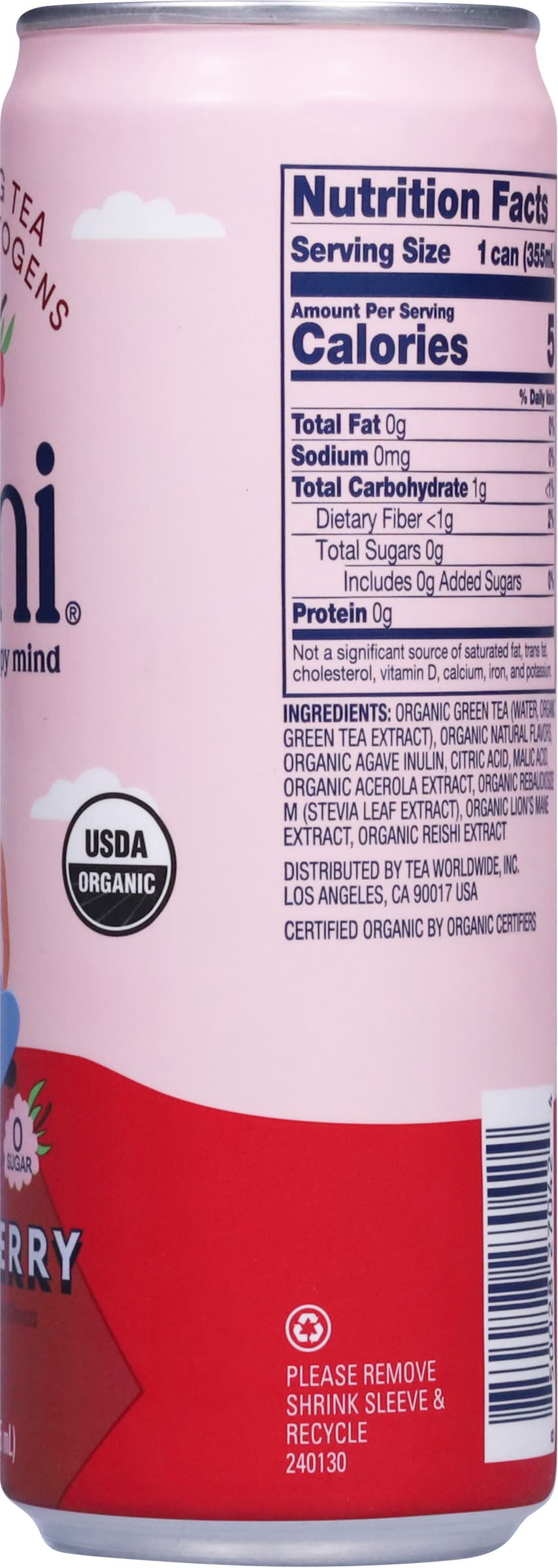 Ingredients: Organic Green Tea (Water, Organic Green Tea Extract), Organic Natural Flavors, Organic Agave Inulin, Citric Acid, Malic Acid, Organic Acerola Extract, Organic Rebaudioside M (Stevia Leaf Extract), Organic Lion's Mane Extract, Organic Reishi Extract
