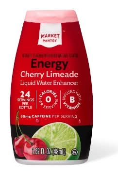 Add delicious, bold flavor and a boost of energy to your water with this Cherry Limeade Liquid Water Enhancer Drops with Caffeine from market pantry™. This 1.62 fluid ounce container of liquid water enhancer concentrate comes in a refreshing cherry limeade that's naturally flavored with other natural flavors. To use, simply squeeze a drop into 8 ounces of water and either shake it up in your water bottle or stir in a glass. Each 1/2 teaspoon serving contains 0 calories and 60mg of caffeine for a quick and delicious pick-me-up whenever you need one. Flavor: Cherry limeade