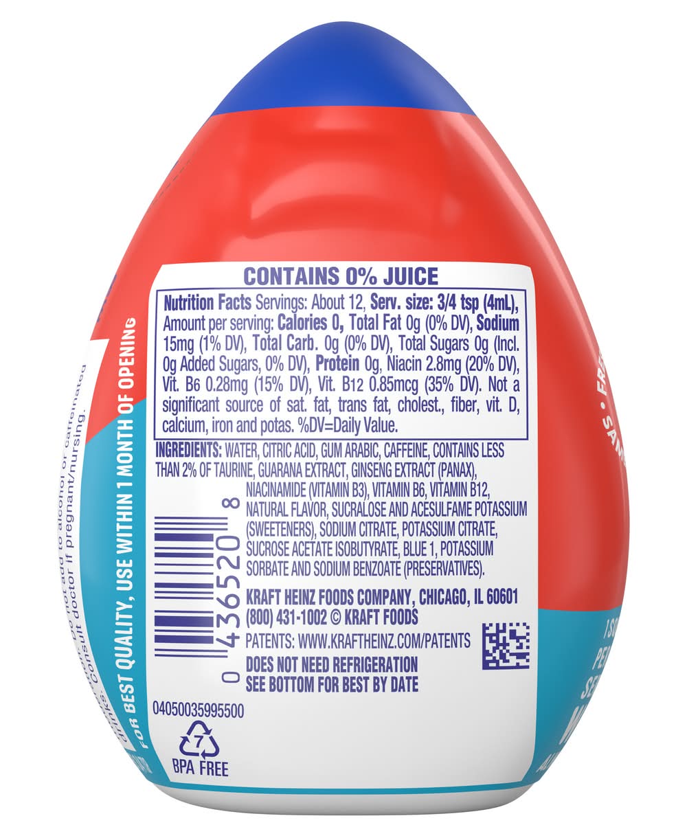 Energy with other natural flavor Liquid Water Enhancer helps you on your wellness journey by making it easier to get a caffeine boost while hydrating with water. Sugar-free water-enhancing drops contain zero calories, and you can control the caffeine and flavor intensity with just a squeeze. One bottle gives you the power of 9 energy drinks in your pocket Each serving contains 90 mg of caffeine, making us the perfect partner for your busy routine and staying energized on the go. Keep a bottle of our water enhancer drops in your purse, bag or glove box for easy on-the-go portable flavor and caffeine anytime. • Flavor: Wicked blue citrus • Kraft Heinz Foods Company, Chicago,IL,60601,800-431-1002,www.kraftheinz.com. • Packaging: Reusable