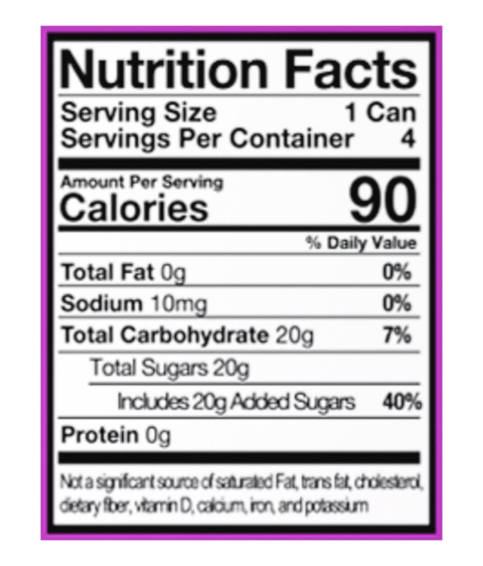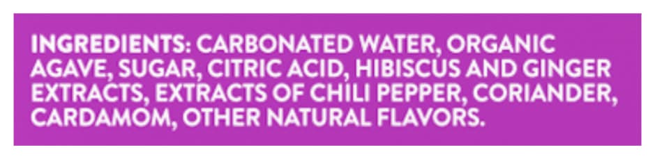 Ingredients: Carbonated Water, Organic Agave, Sugar, Citric Acid, Hibiscus and Ginger Extracts, Extracts of Chili Pepper, Coriander, Cardamom, Other Natural Flavors