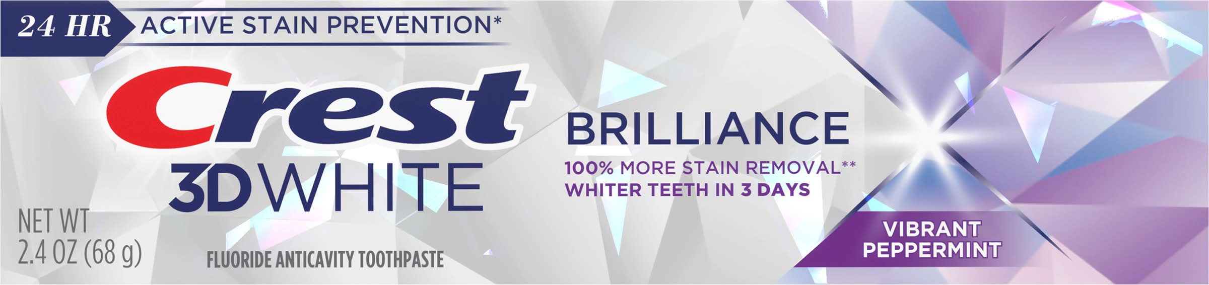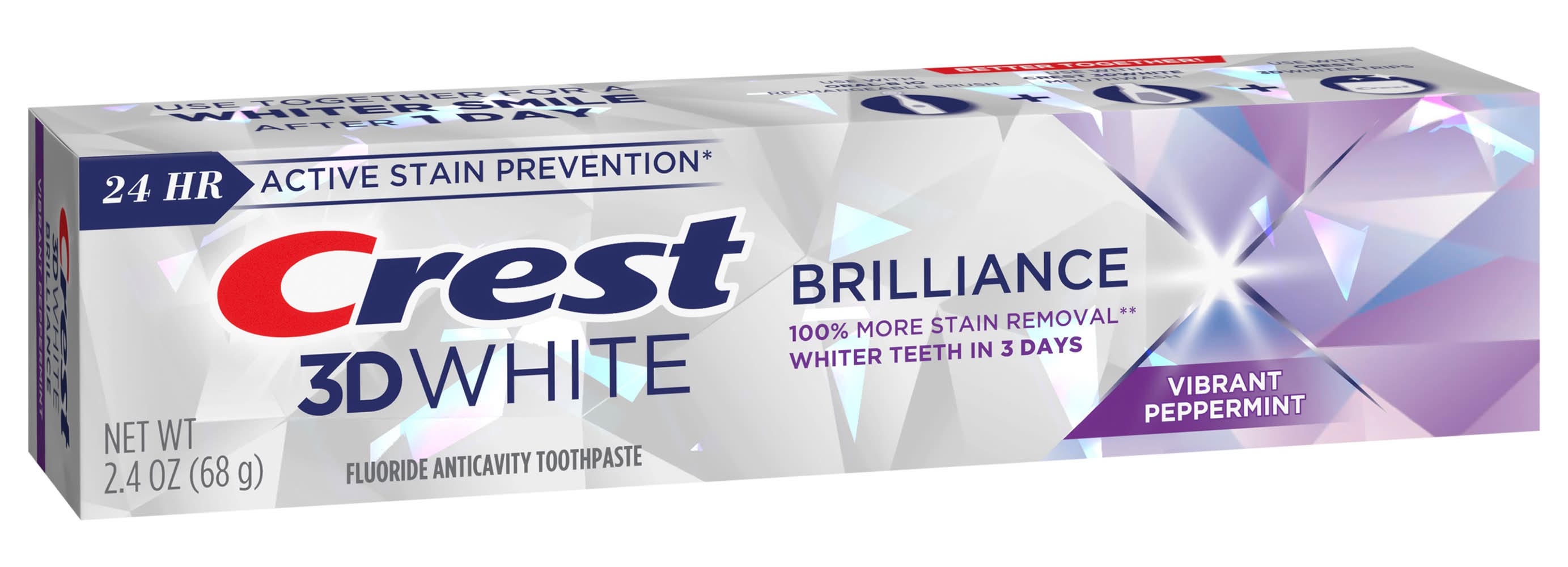 Crest 3D White Brilliance Toothpaste gives you Whiter Teeth in 3 days by removing 100% more surface stains. This Crest 3D White Brilliance Toothpaste comes with 24-hour stain protection when paired with twice-daily brushing. The Crest 3D White Brilliance toothpaste formula contains fluoride, which helps fight cavities while whitening teeth by micro-cleansing each tooth and removing surface stains. From America's #1 Whitening Brand*. *P&G calculation based on U.S. reported sales data for year ending w/o 1/05/25 vs. regular toothpaste.
