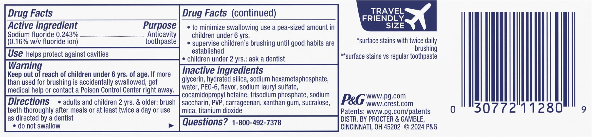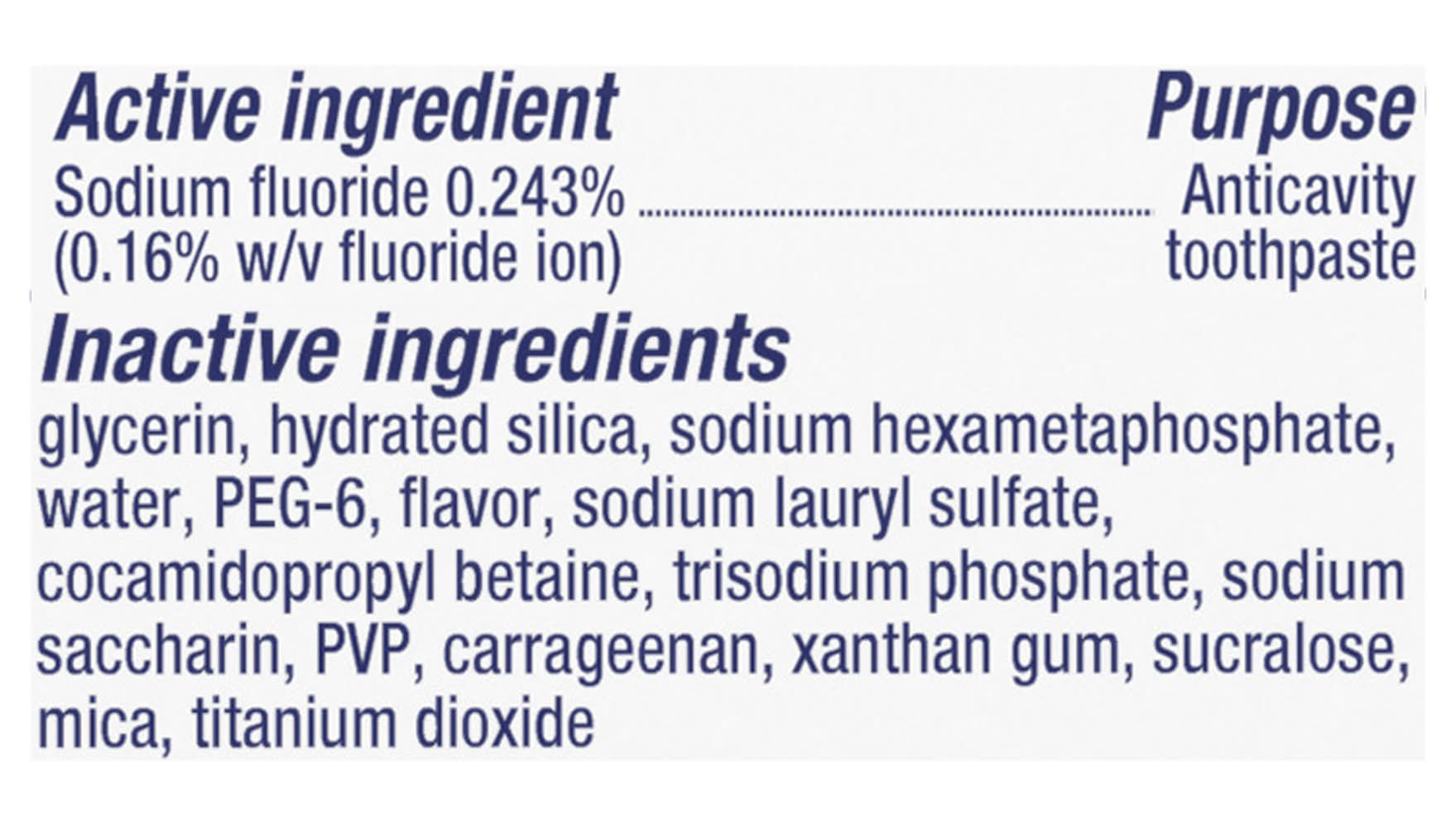 Ingredients: Active Ingredients: Sodium Fluoride (0.16% w/v Fluoride Ion) (0.243 %), Anticavity Toothpaste. Inactive Ingredients: Glycerin, Hydrated Silica, Water, PEG-6, Flavor, Sodium Lauryl Sulfate, Cocamidopropyl Betaine, Trisodium Phosphate, Sodium Saccharin, PVP, Carrageenan, Xanthan Gum, Sucralose, Mica, Titanium Dioxide