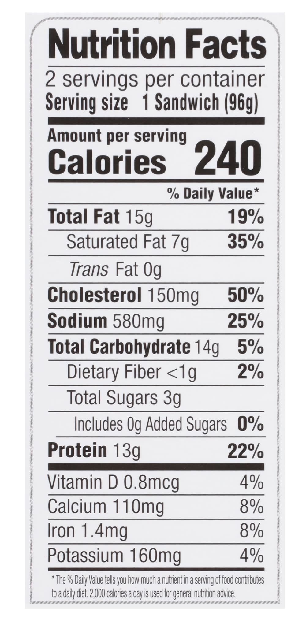 Ingredients: Chicken Sausage Patty (Chicken, Water, Salt, Spices, Sugar), Croissant (Enriched Wheat Flour [Wheat Flour, Niacin, Reduced Iron, Ascorbic Acid Added as a Dough Conditioner, Thiamine Mononitrate, Riboflavin, Enzymes, Folic Acid), Water, Butter (Cream, Natural Flavors), Sugar, Eggs, Dry Whole Milk, Yeast, Salt, Acacia, Sodium Stearoyl Lactylate, Corn Syrup, Malted Barley Extract, Enzymes), Egg Patty (Whole Egg, Whole Milk, Corn Starch, Sea Salt, White Pepper), American Cheese ((Cultured Milk, Salt, Enzymes), Wafer, Cream, Sodium Phosphate, Salt, Apo-Carotenal and Beta-Carotene (Color)] Contains: Eggs, Milk, Wheat, Corn, Barley, Sesame, Soybeans