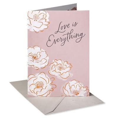 Whether you’re celebrating an engagement, a shower, a wedding, an anniversary, or anything in between, this card reminds them that “Love is everything.” The pale pink hue is accented by florals and metallic copper accents that add a bit of special sparkle to your wish. It’s a great card for any love-filled couple on a love-filled occasion. Envelope included. Size: 4.625x6.75 in