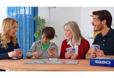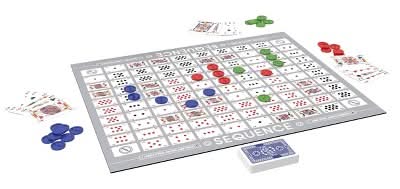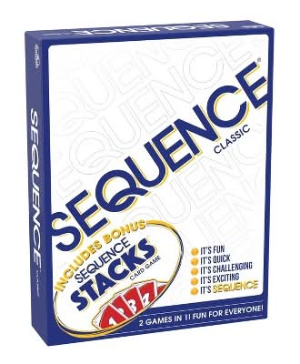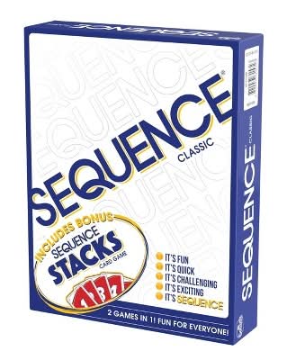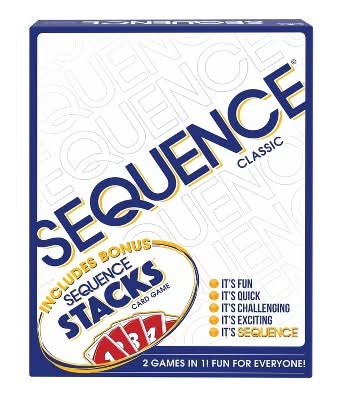 It's fun, it's challenging, it's exciting, it's SEQUENCE! Play a card from your hand, and place a chip on a corresponding space on the game board. When you have five in a row, it's a SEQUENCE. Learn to block your opponents or remove their chips, and watch out for the Jacks - they're wild! With a little strategy and luck, you'll be a winner. For 2-12 players, ages 7 and up. Includes a BONUS card game - SEQUENCE Stacks! On your turn, try to play the cards from your hand or the top card from your discard pile to create runs of 1-5 on the decks in the middle. Complete the run to capture the SEQUENCE and earn a matching colored SEQUENCE chip. The first player to earn 5 SEQUENCE chips, made up of at least two blue and two red, wins! For 2-6 players, ages 7 and up. It's double the SEQUENCE fun! Includes 1 Folding Game Board, 2 Decks of SEQUENCE Playing Cards, 135 Playing Chips, Complete Instructions, and BONUS