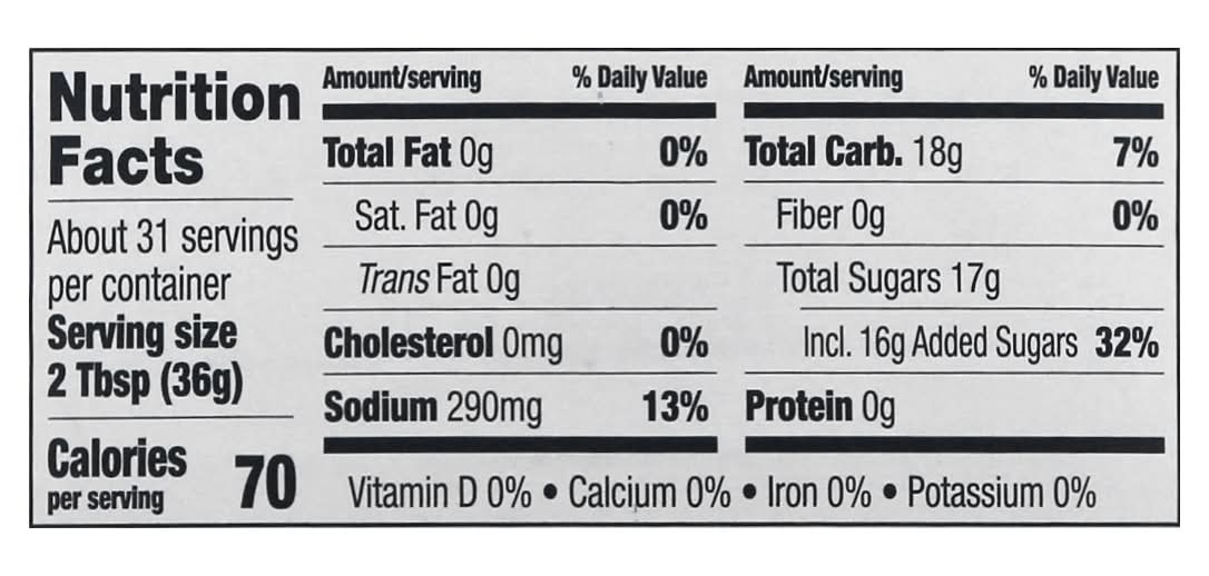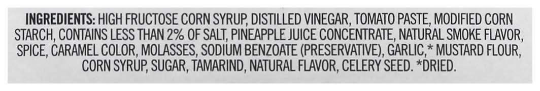 Ingredients: High Fructose Corn Syrup, Distilled Vinegar, Tomato Paste, Modified Corn Starch, Contains Less than 2% of Salt, Pineapple Juice Concentrate, Natural Smoke Flavor, Spice, Caramel Color, Molasses, Sodium Benzoate Preservative, Garlic Dried, Mustard Flour, Corn Syrup, Sugar, Tamarind, Natural Flavor, Celery Seed.