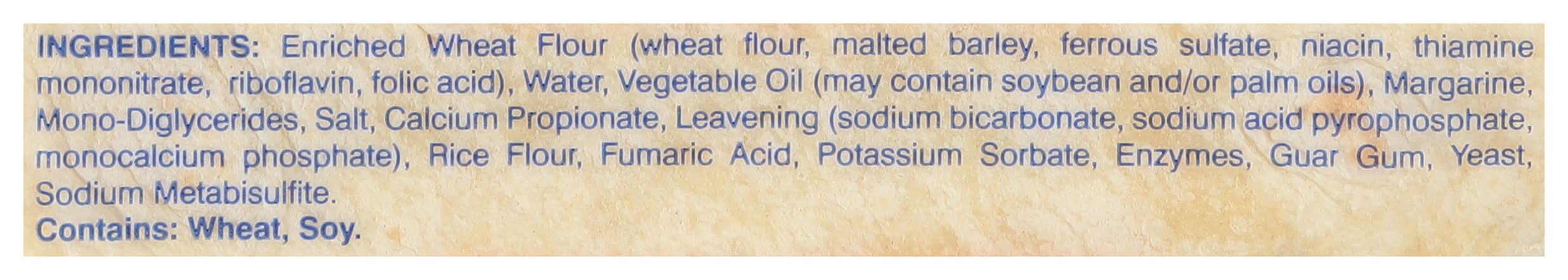 Ingredients: Enriched Wheat Flour (Wheat Flour, Malted Barley, Ferrous Sulfate, Niacin, Thiamine Mononitrate, Riboflavin, Folic Acid), Water, Vegetable Oil (May Contain Soybean and/or Palm Oils), Margarine, Mono-Diglycerides, Salt, Calcium Propionate, Leavening (Sodium Bicarbonate, Sodium Acid Pyrophosphate, Monocalcium Phosphate), Rice Flour, Fumaric Acid, Potassium Sorbate, Enzymes, Guar Gum, Yeast, Sodium Metabisulfite Contains: Wheat, Soybeans, Barley, Sulfites