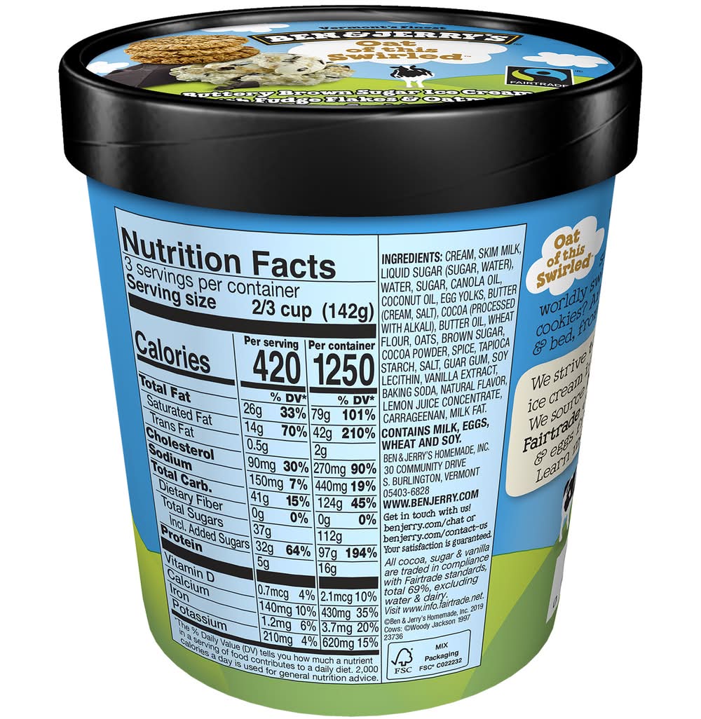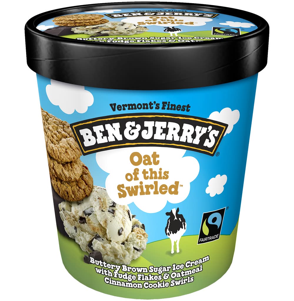 Ben & Jerry's Buttery brown sugar ice cream pint with fudge flakes and oatmeal cinnamon cookie swirls. It’s an Out of This Swirled ice cream flavor that could only come from your friends at Ben & Jerry’s. We love cookies. All kinds of cookies. Especially oatmeal cookies. We don’t know what it is, but there’s just something about how the hints of cinnamon mingle with the brown sugar that’s…well, out of this world! It flashes us back to our childhood, digging into a savory stash of grandma’s fresh baked cookies. Are you one to reminisce on the good ol’ days? Leave it to Ben & Jerry’s to find a way to capture that magic in a just-like-homemade ice cream creation. So slide into those PJs, grab a spoon, and settle in because it’s over the swirls and through the chunks to grandmother’s house we go. We’re proud of our products and the people behind them. That’s why we work with Fairtrade certified producers for the cocoa, sugar, and vanilla in this premium ice cream flavor. All of Ben & Jerry’s ice cream treats are made with non-GMO sourced ingredients and eggs from cage-free hens. Responsibly sourced packaging gets this ice cream pint from our Vermont factory to your freezer. • Flavor: Oat of this swirled • Ben & Jerrys Homemade, S. Burlington, VT