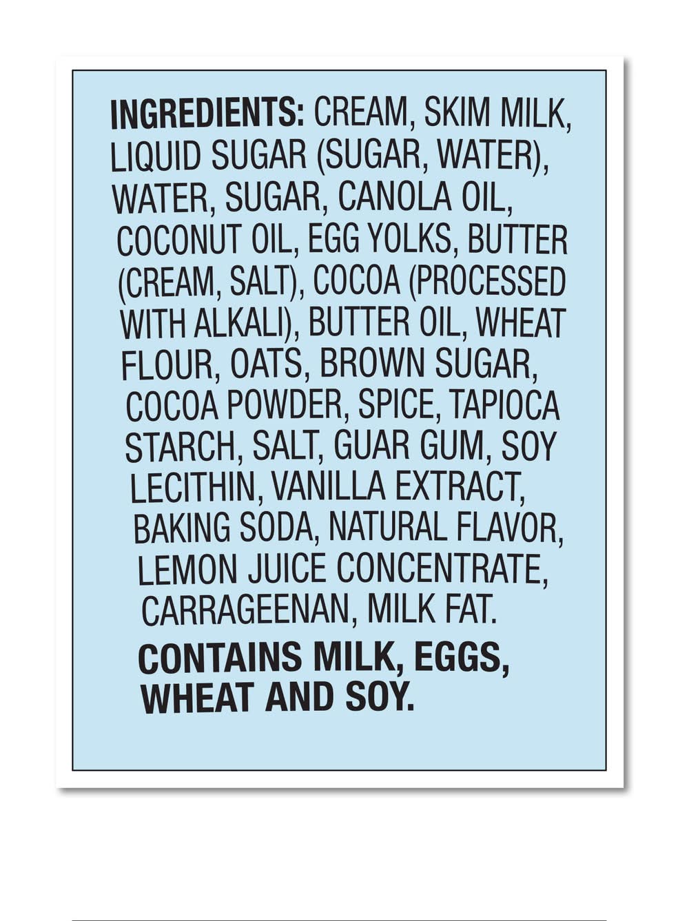 Ingredients: Cream, Skim Milk, Liquid Sugar Sugar, Water, Water, Sugar, Canola Oil, Coconut Oil, Egg Yolks, Butter Cream, Salt, Cocoa Processed with Alkali, Butter Oil, Wheat Flour, Oats, Brown Sugar, Cocoa Powder, Spice, Tapioca Starch, Salt, Guar Gum, Soy Lecithin, Vanilla Extract, Baking Soda, Natural Flavor, Lemon Juice Concentrate, Carrageenan, Milk Fat. Contains: Eggs, Milk, Soybeans, Wheat, Oat