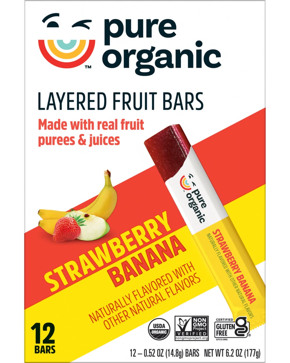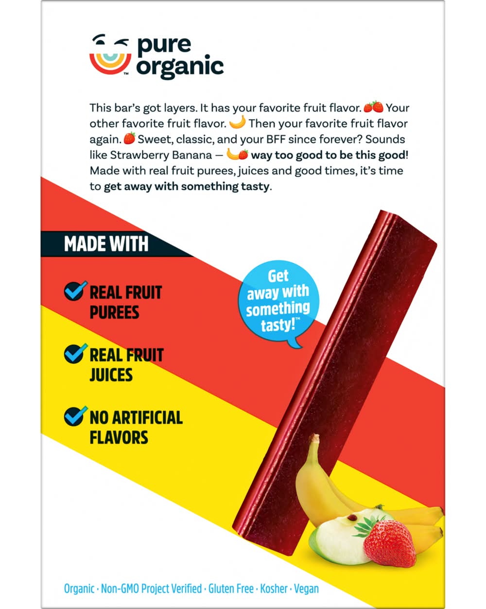 They're just way too good to be this good. These Pure Organic Strawberry Banana layered fruit bars are made with real fruit purees and juices. Tangy, sweet, tasty, and unforgettably stacked with flavor, they're made with simple ingredients. With no artificial flavors or synthetic colors, you can feel good about sharing a delicious moment; Each snack bar is Certified USDA Organic, Non-GMO Project Verified, vegan, gluten free and kosher for guilt-free snacking. Pure Organic snacks are individually wrapped, making them perfect for taking along with you wherever you go including lunch snacks, road trips, and afternoon snacks. We think you're about to get away with something tasty. Packaging: Reusable
